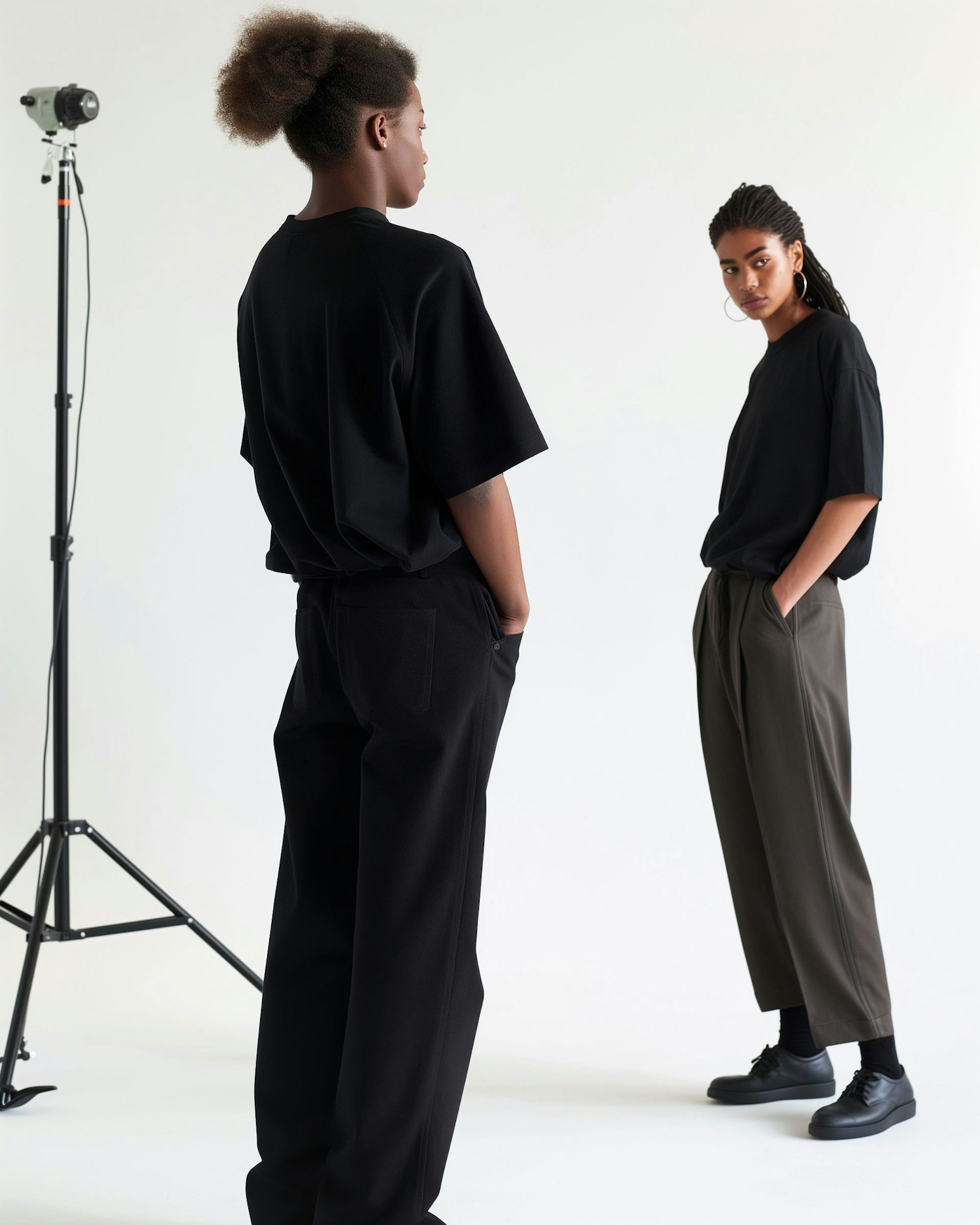 Two stylish individuals in a minimalist studio, wearing black t-shirts and pants, with a focus on modern, casual fashion.