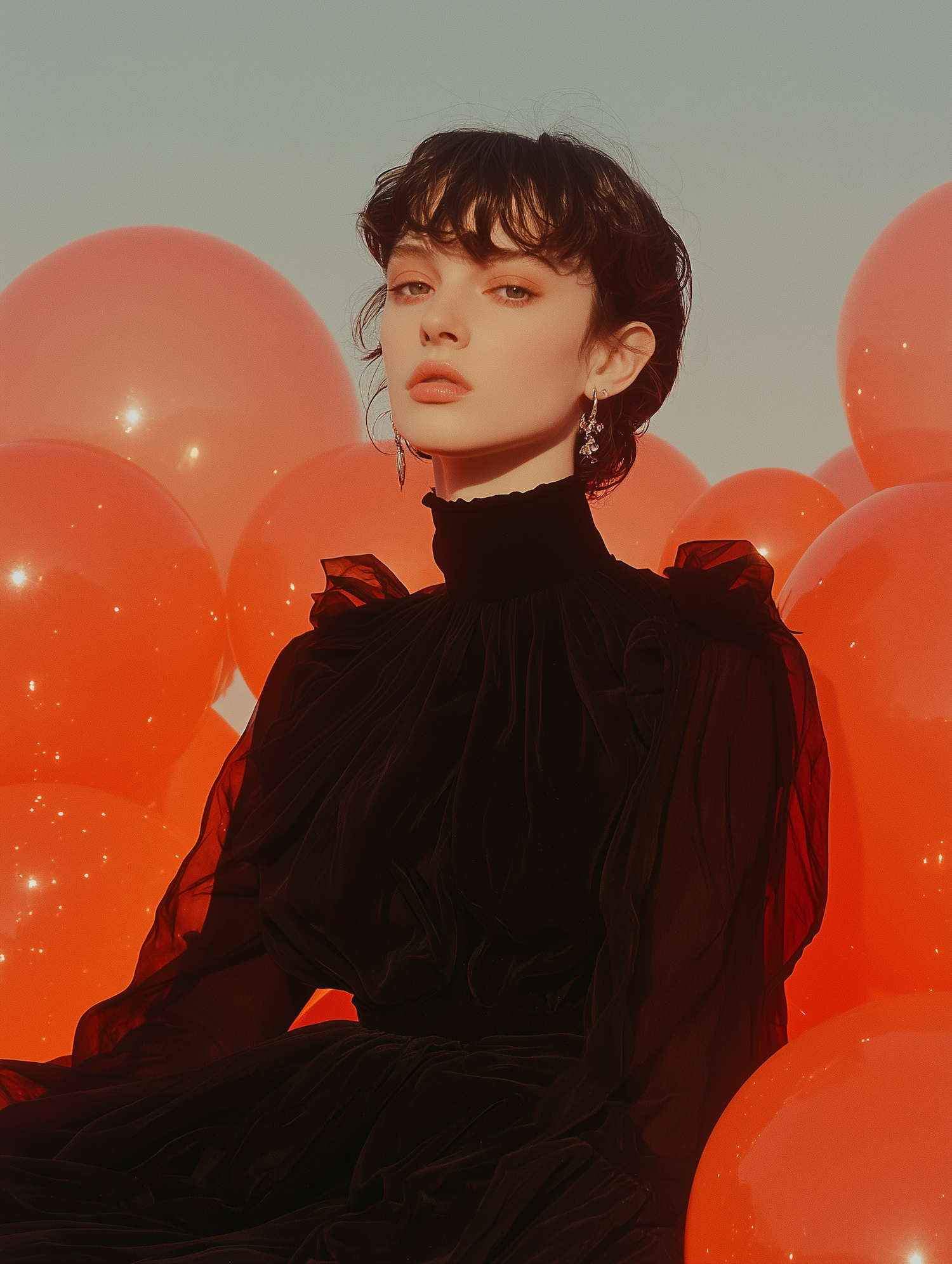 Elegant woman in a black dress surrounded by vibrant orange balloons, exuding confidence and style.