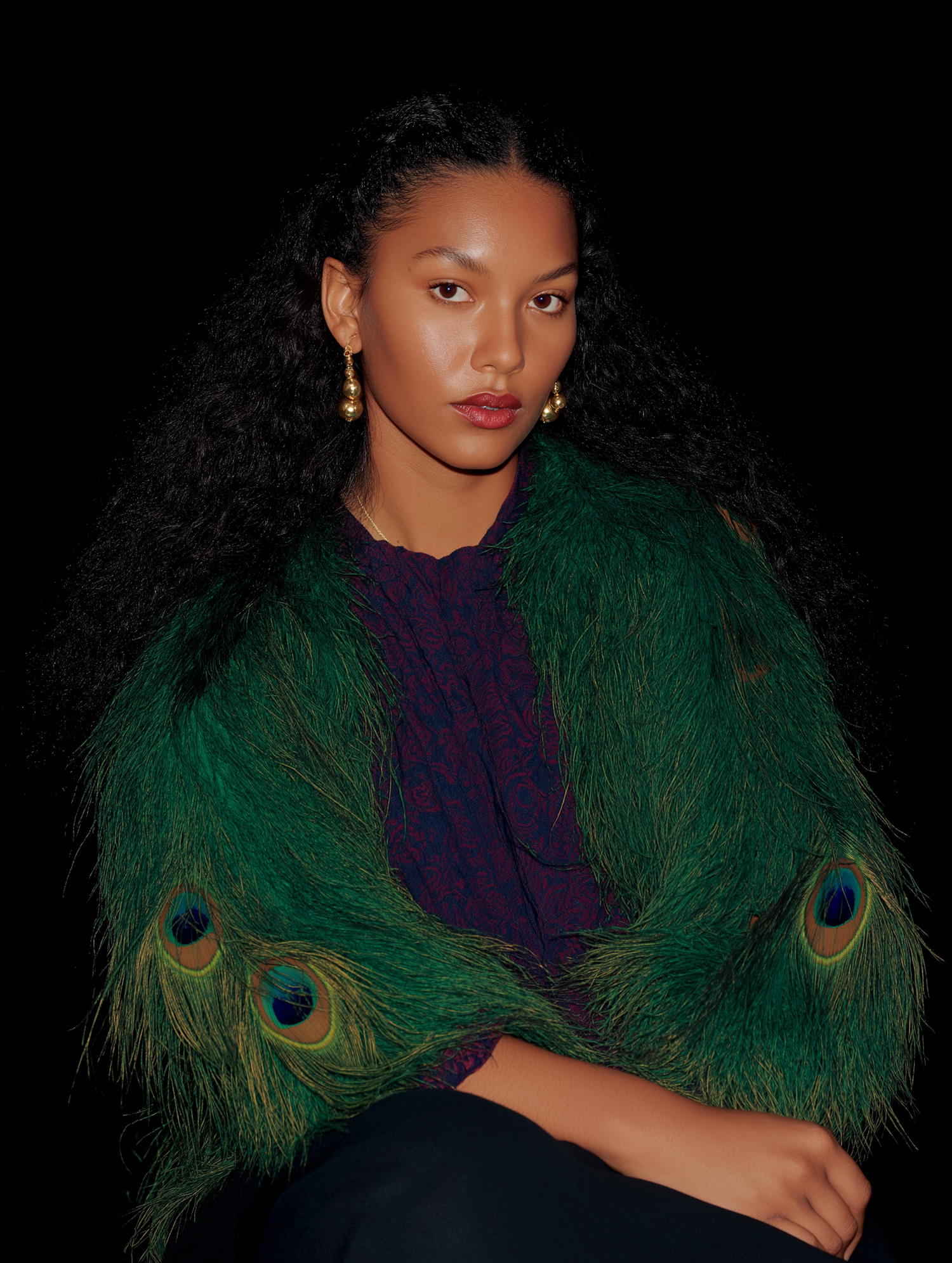 Elegant woman in a green peacock feather shawl, wearing gold earrings, against a black background.