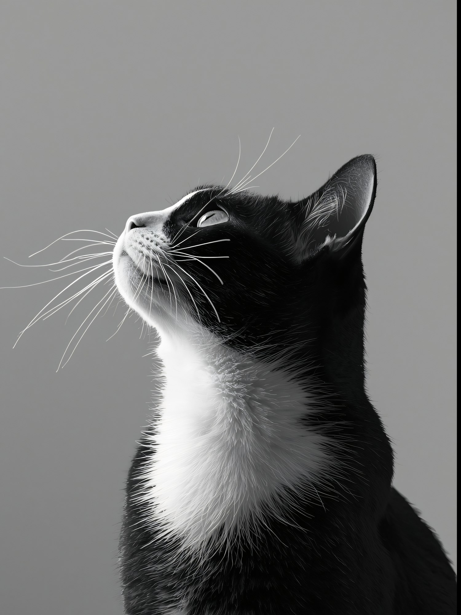 A black and white cat gazes upward in a minimalist setting, showcasing its sleek fur and prominent whiskers against a neutral gray background.