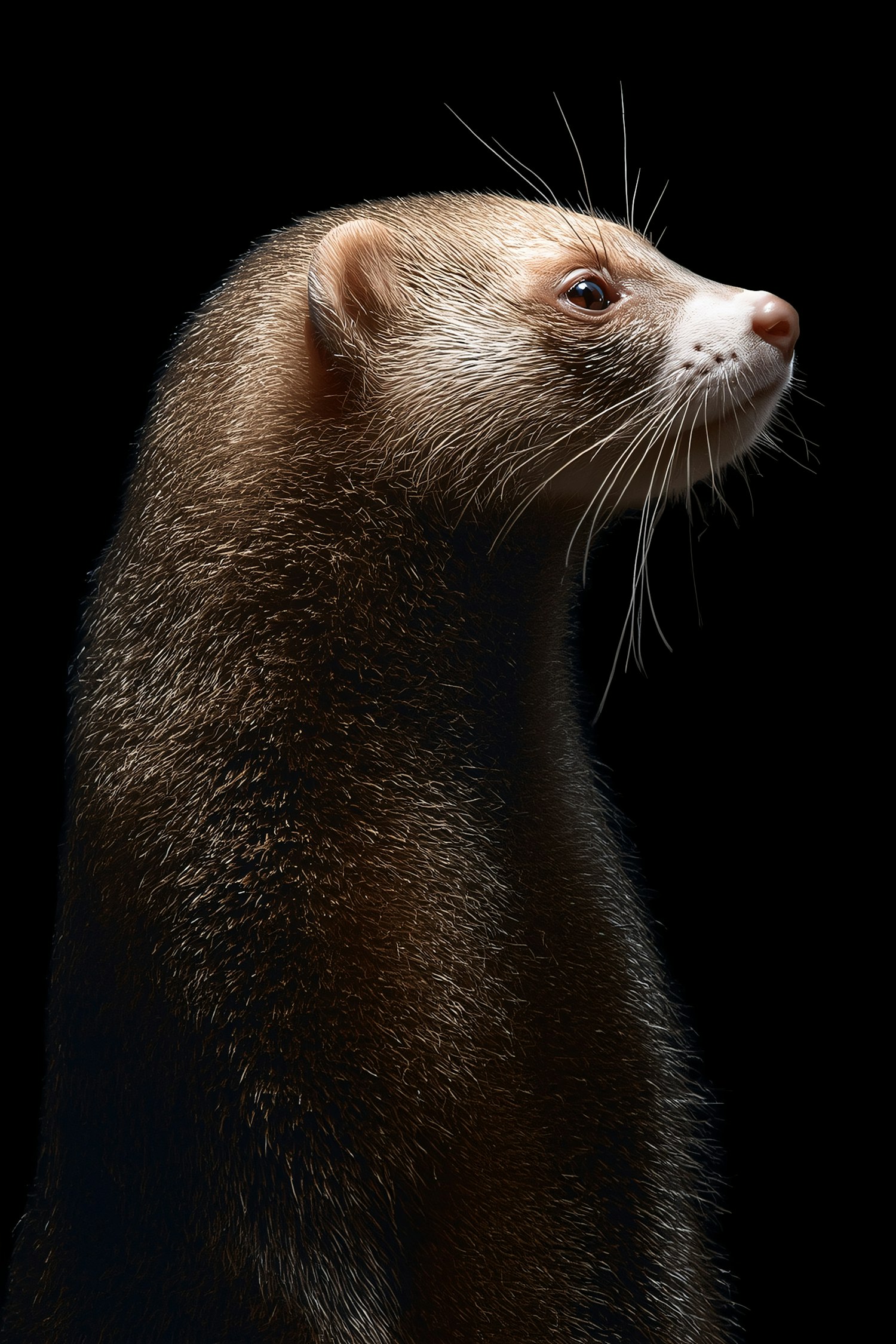 A close-up of a ferret with detailed fur texture, set against a black background, highlighting its whiskers and expressive eyes.