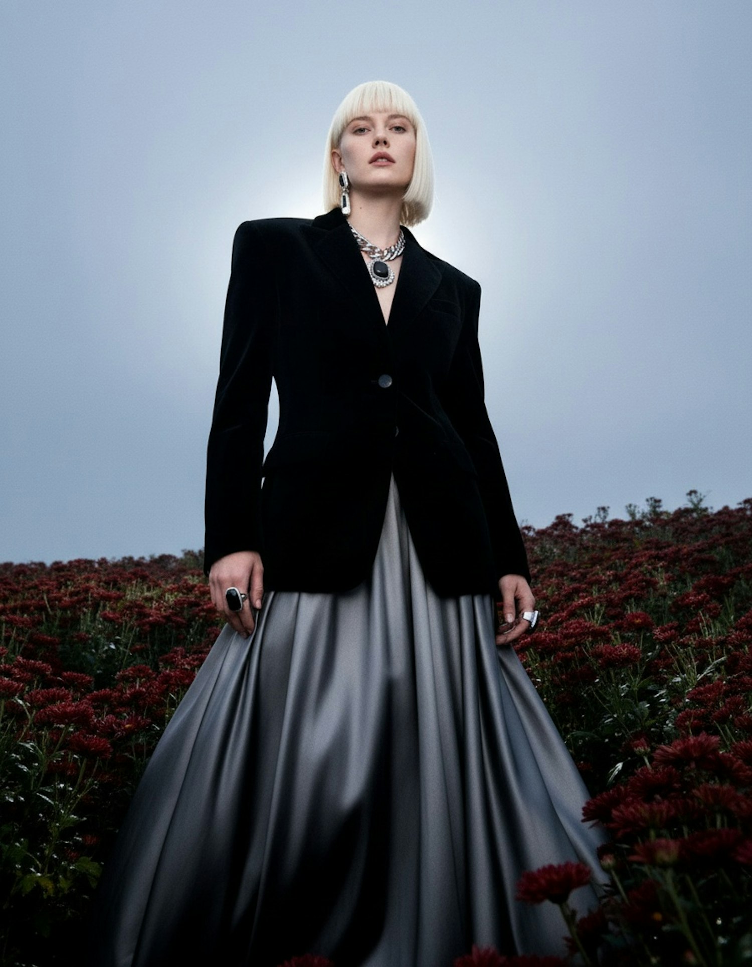 A striking portrait of a person in a black blazer and silver skirt, standing in a field of red flowers under a clear sky.