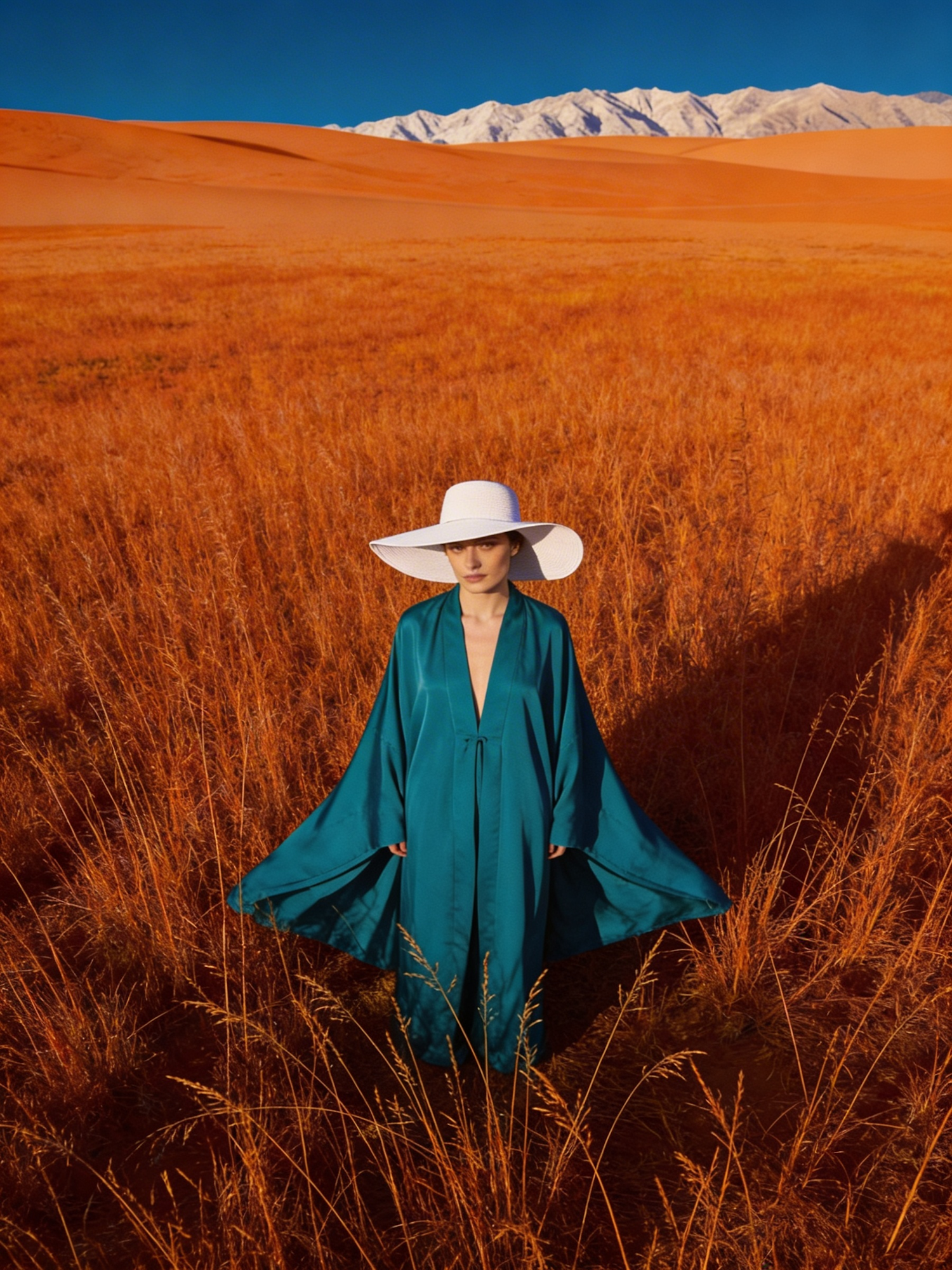 A person in a teal outfit and white hat stands in an orange field with snow-capped mountains in the background under a clear blue sky.