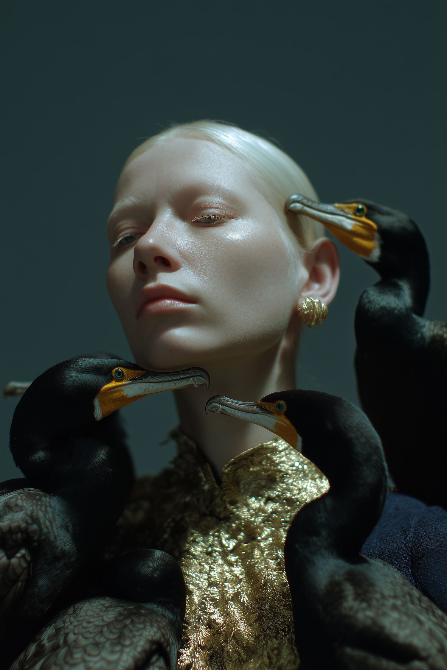 Artistic depiction of a pale individual adorned with gold and surrounded by vivid black cormorants against a muted background.