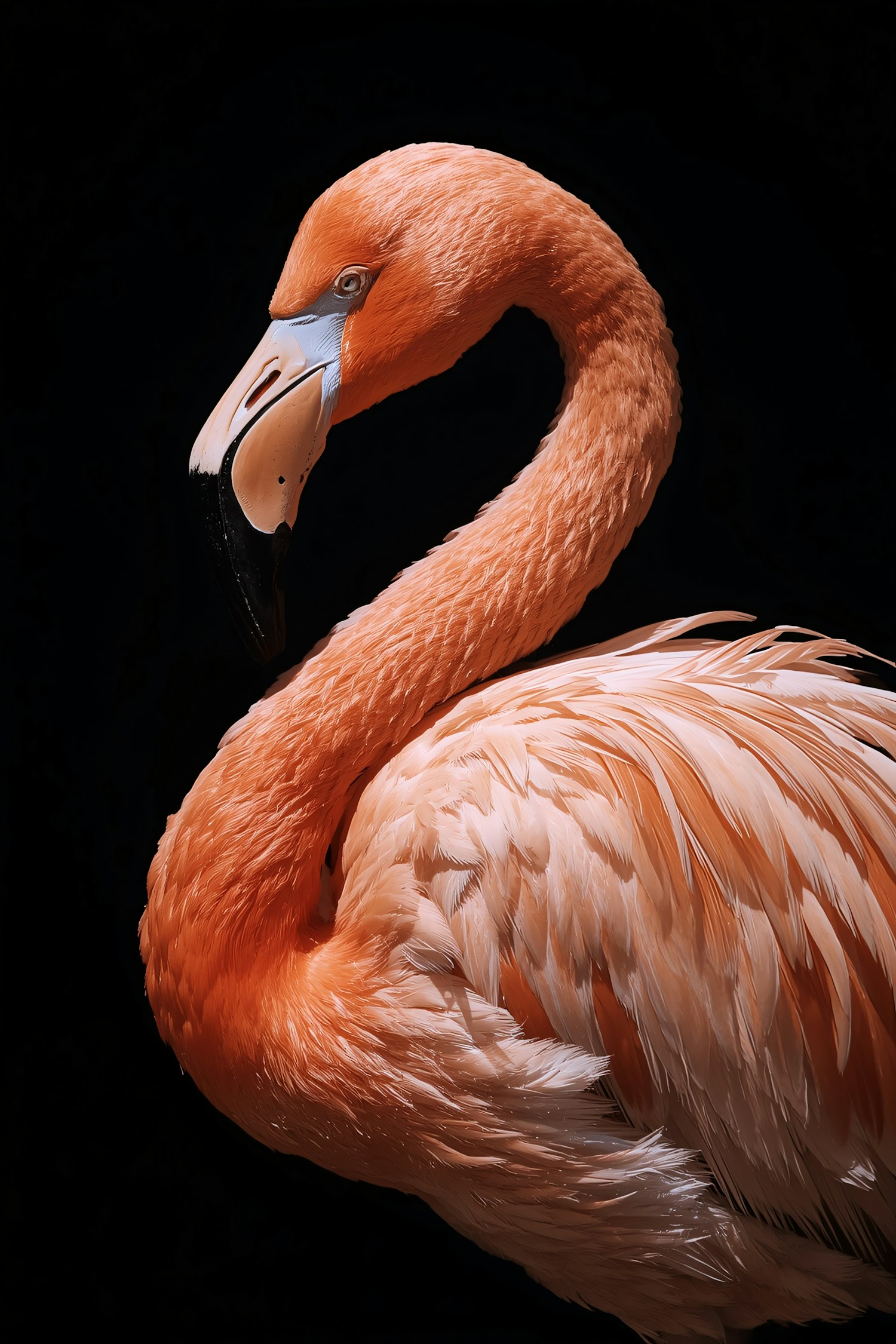 A stunning close-up of a flamingo with vibrant pink feathers and a dark background, showcasing its elegant pose and intricate details.