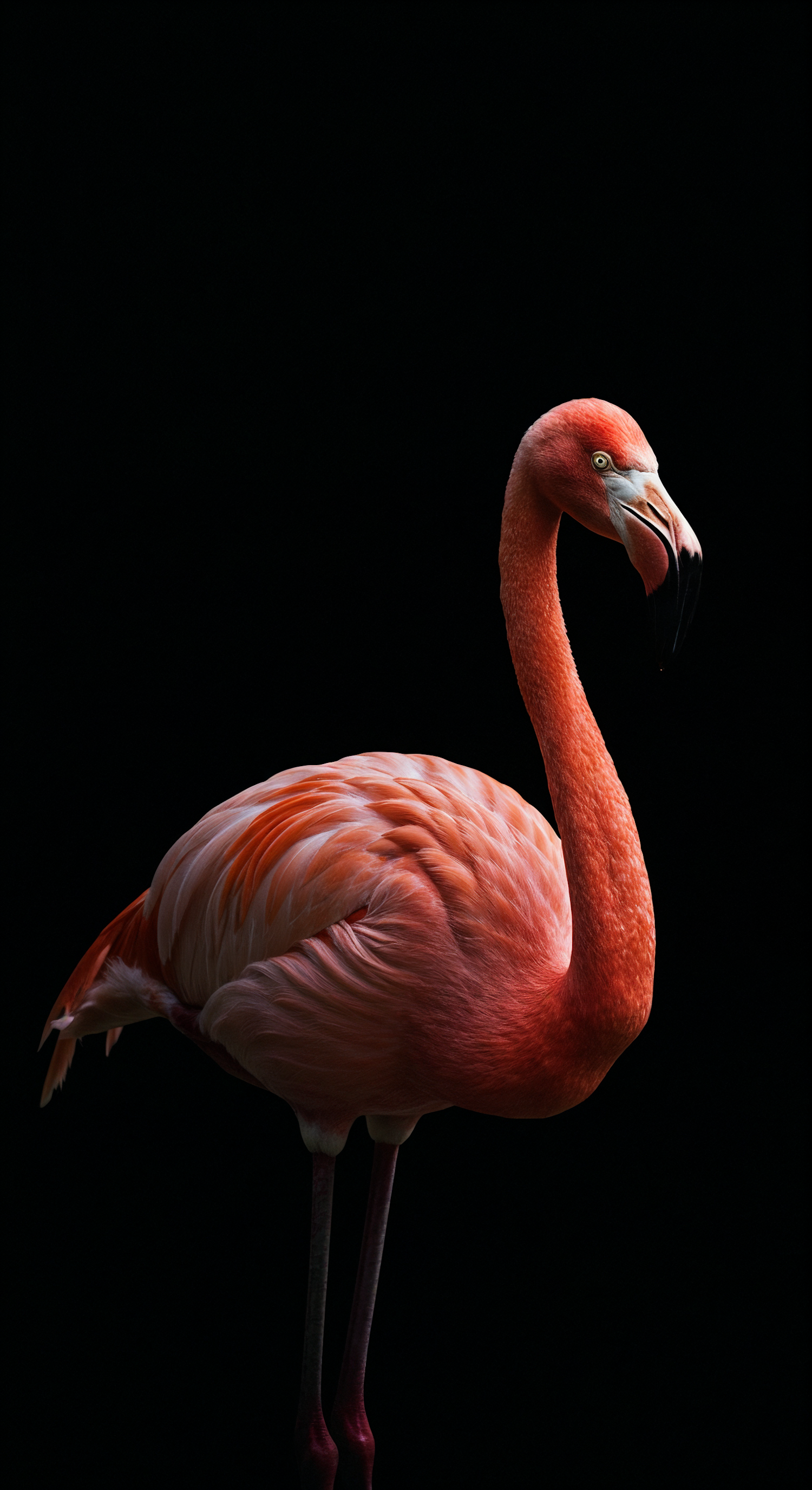 A vibrant flamingo with pink-orange feathers and a black-tipped beak stands gracefully against a black background, creating a dramatic contrast.