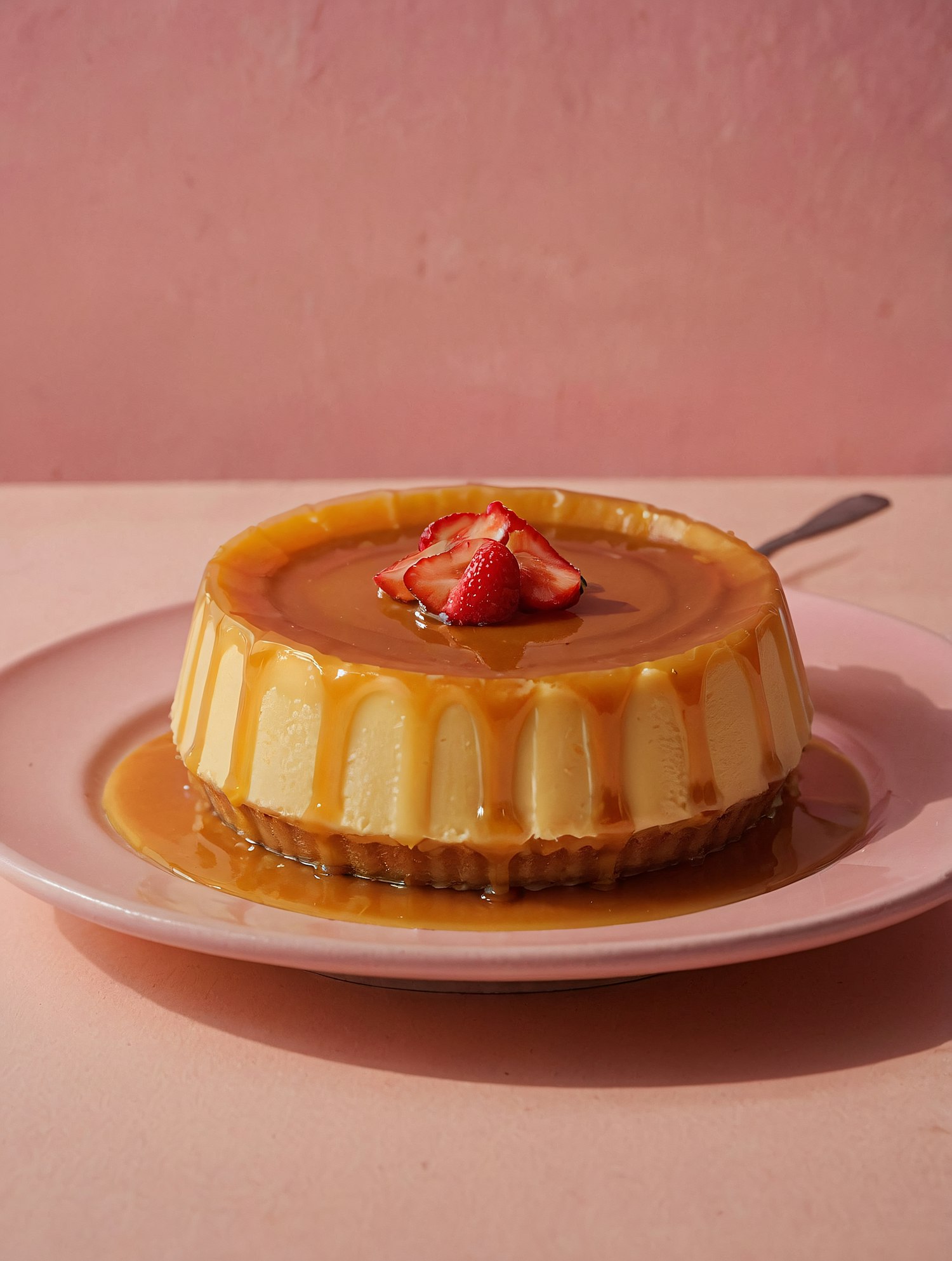 A luscious flan topped with caramel sauce and fresh strawberries on a pink plate, set against a pastel pink background.