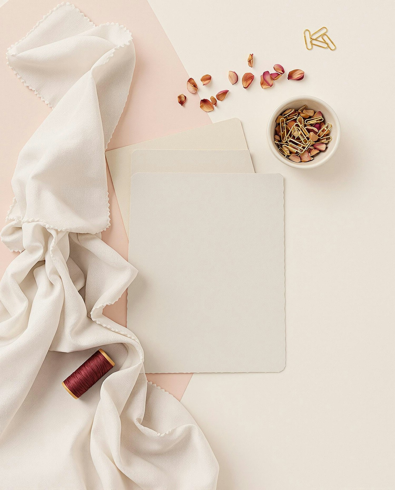 Elegant flat lay with white fabric, beige paper, burgundy thread, gold paper clips, and dried petals on a pastel background.
