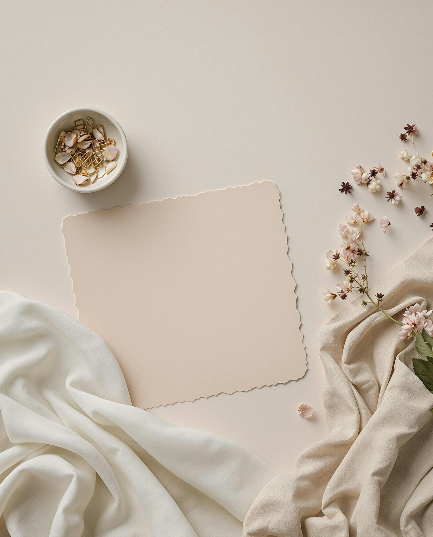 Flat lay of a beige card with scalloped edges, surrounded by soft fabrics, flowers, and a bowl of gold paper clips and petals.