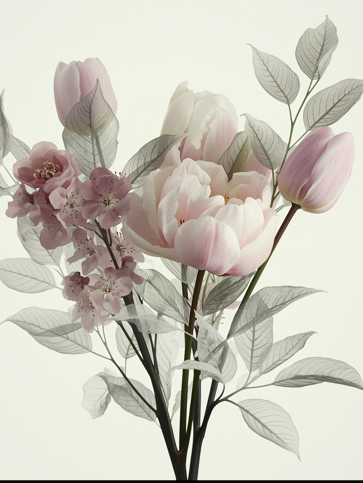 A delicate floral arrangement with soft pink tulips and blossoms, paired with translucent veined leaves on a light background.