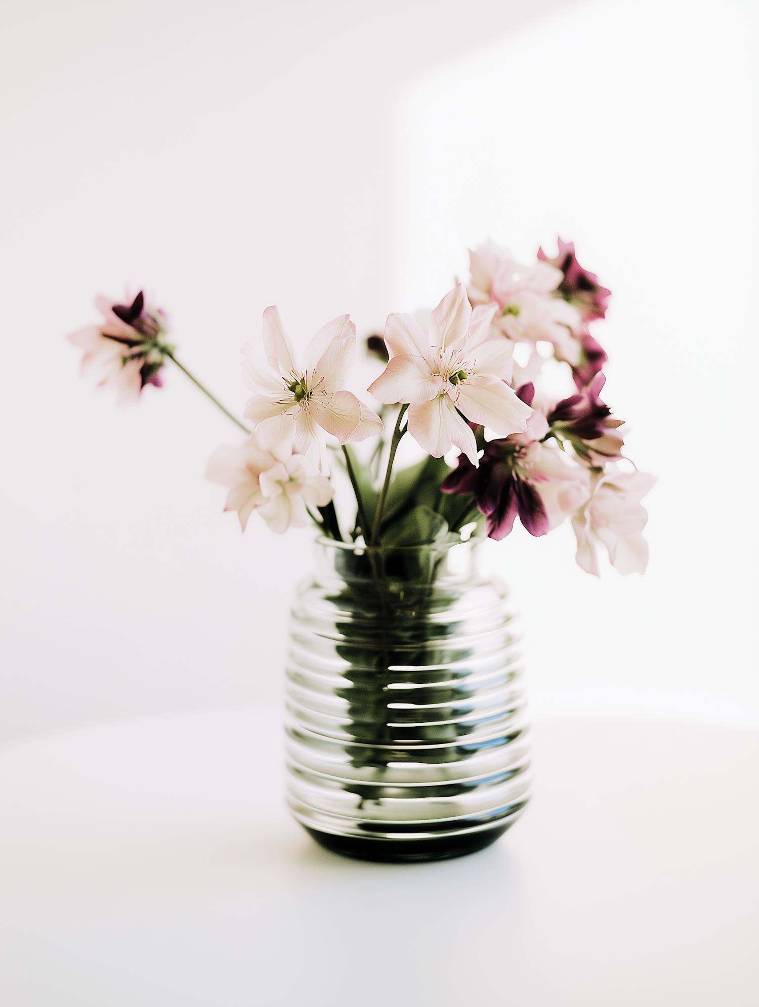 Elegant bouquet of pink and purple flowers in a ribbed glass vase against a minimalist white background.