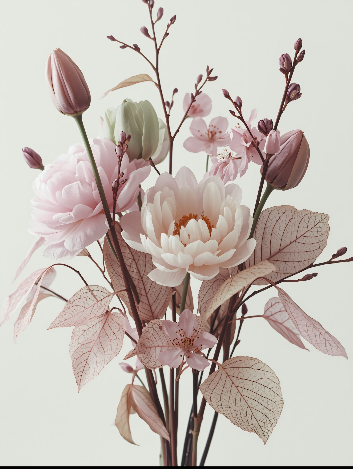 A beautiful floral arrangement with soft pink and white blossoms, including tulips and peonies, accented by delicate, translucent leaves.