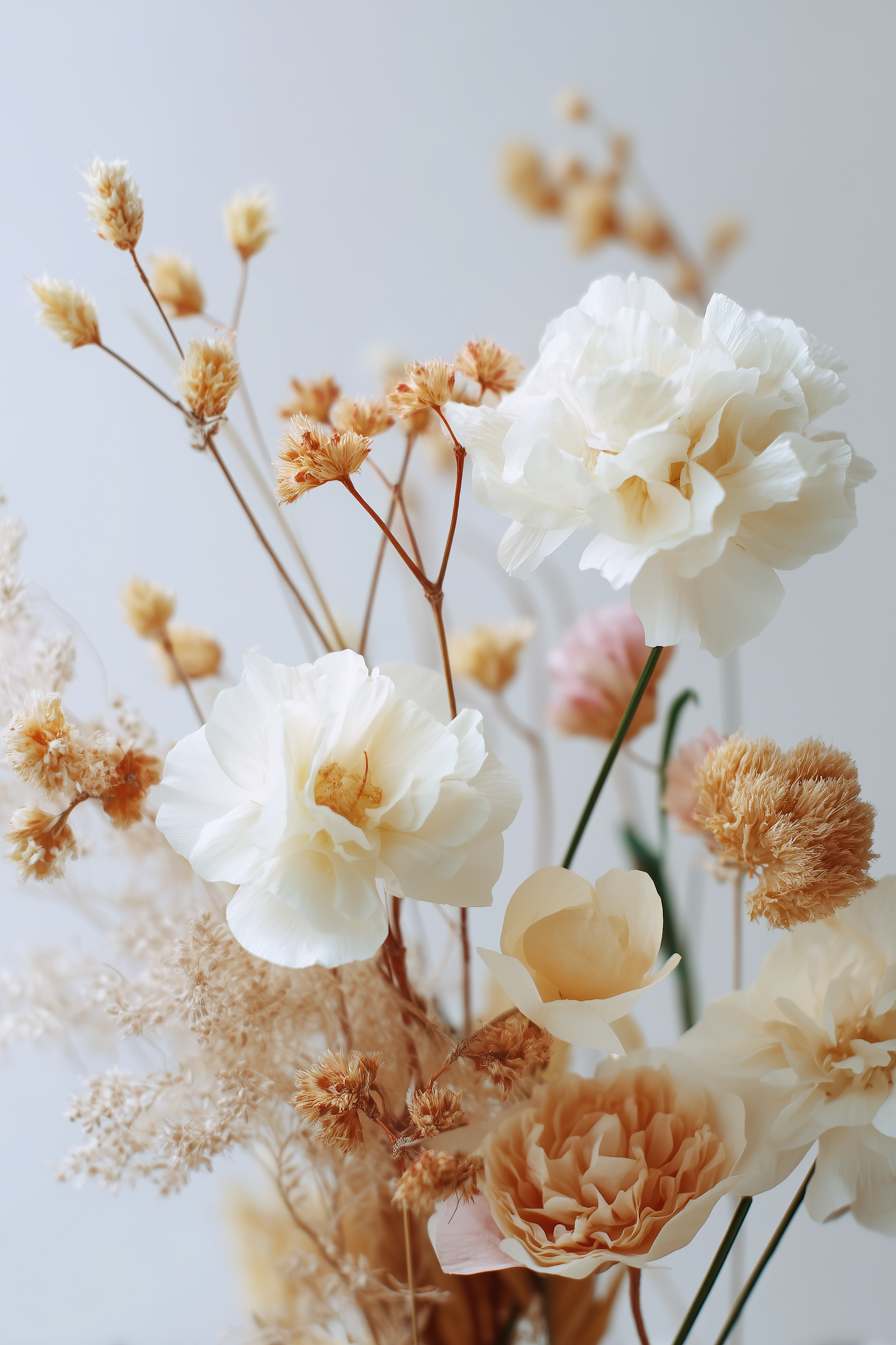 A soft floral arrangement with creamy white blooms and dried beige flowers, perfect for minimalist or rustic decor.