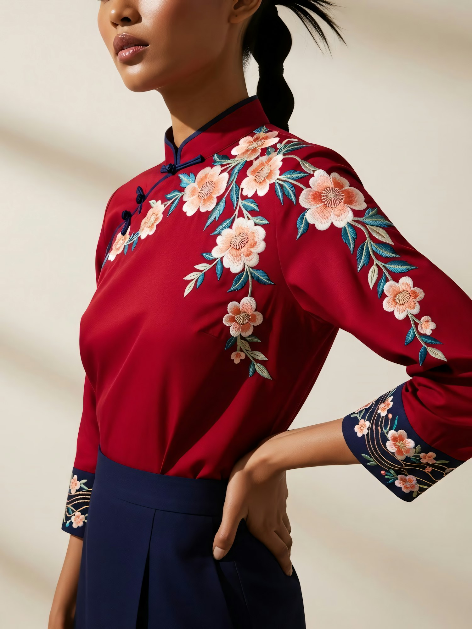 A stylish red blouse with floral embroidery paired with a navy skirt, showcasing intricate details and a traditional design.