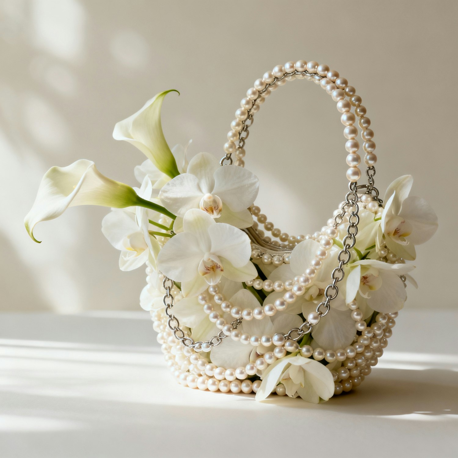 A pearl-adorned basket filled with white orchids and calla lilies, set against a soft, neutral background with elegant lighting.