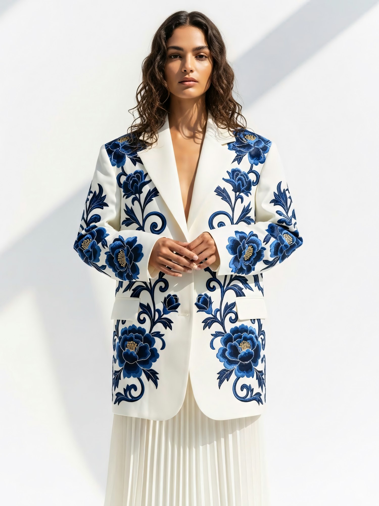 A woman in a white blazer with blue floral embroidery and a pleated skirt stands confidently against a bright, minimalistic background.