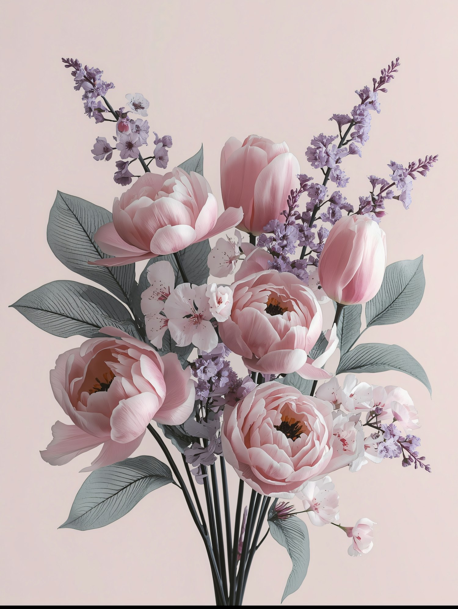 A stunning bouquet of pink peonies, lavender sprigs, and white blossoms against a soft pink background, creating a serene floral composition.