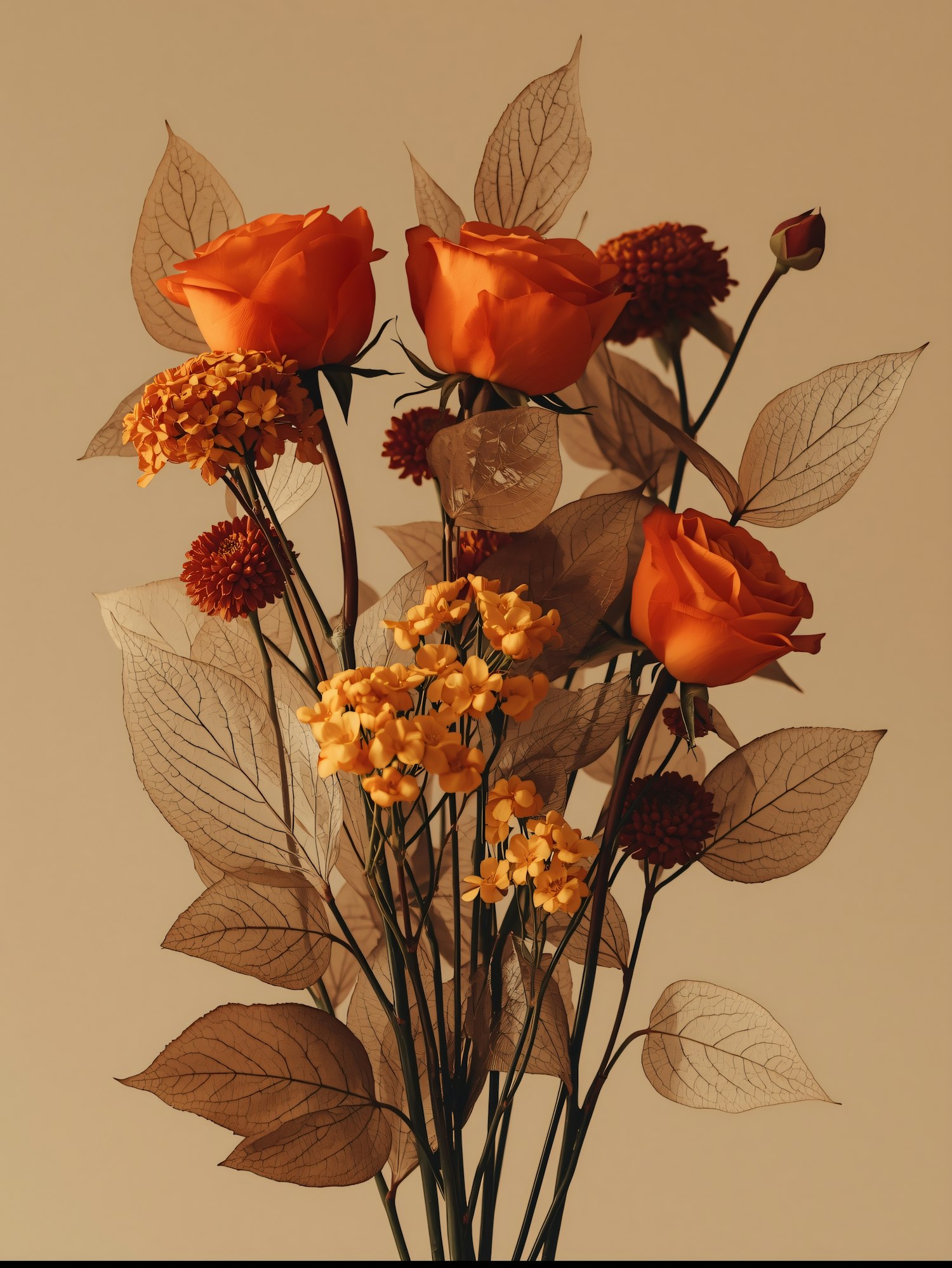 A stunning bouquet of orange roses and yellow flowers with translucent leaves, set against a warm beige background.