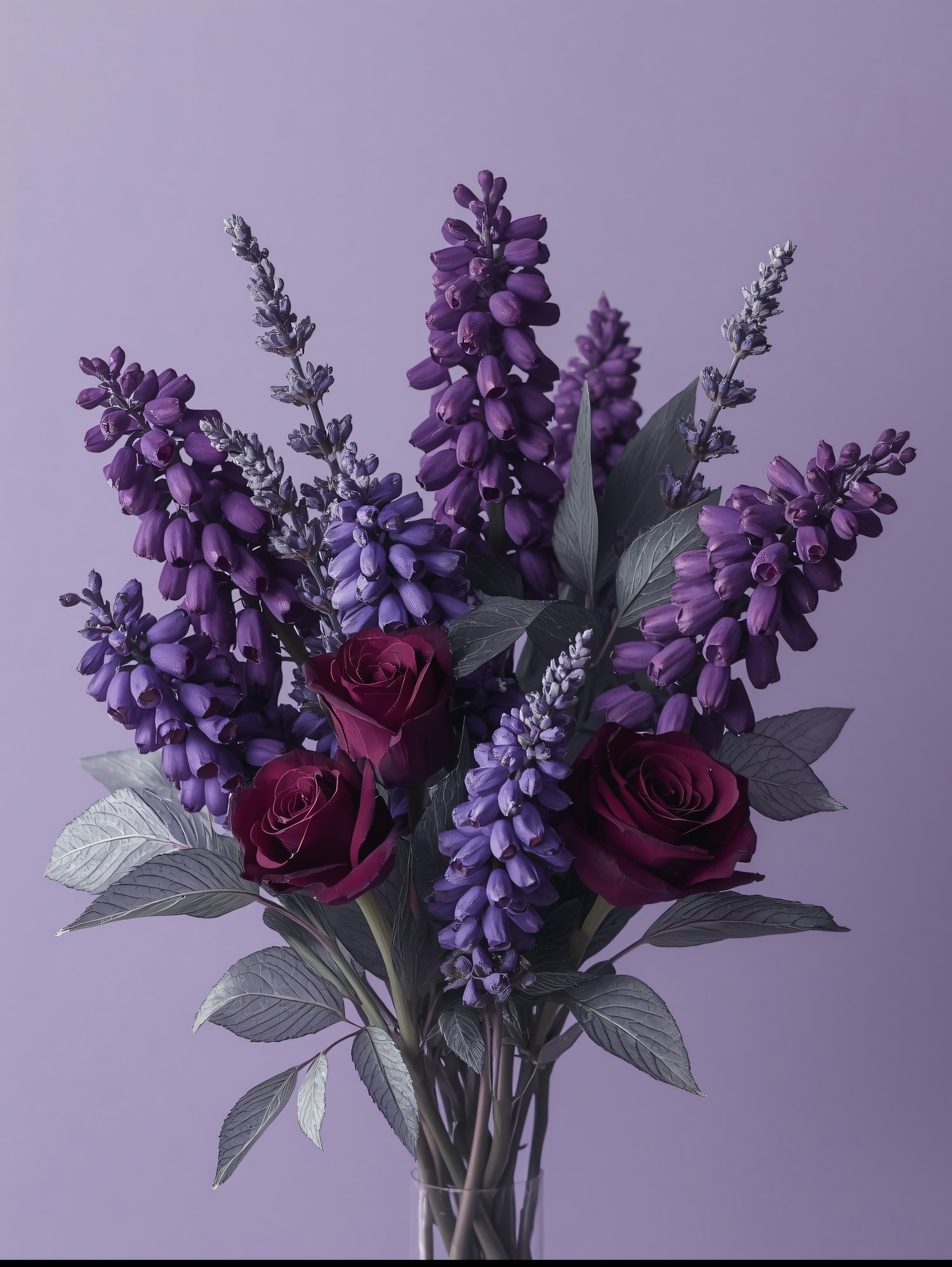 A stunning bouquet of purple lupines and red roses with green leaves, set against a soft purple background, creating a serene composition.