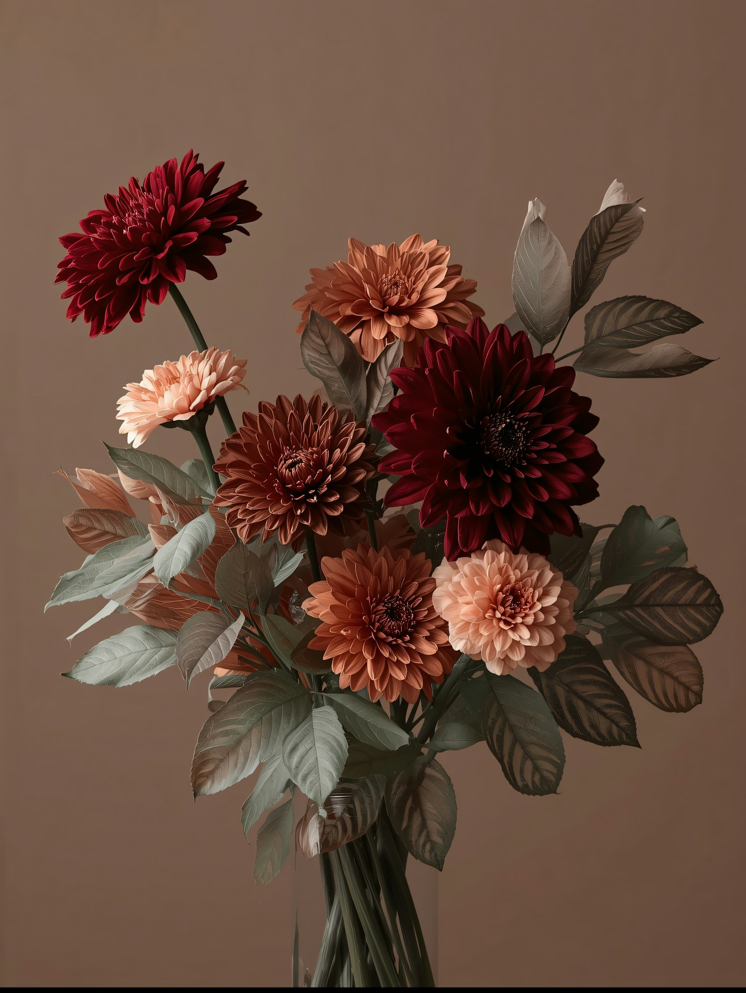 A stunning bouquet of dahlias in shades of burgundy and peach, arranged with green leaves against a neutral brown background.