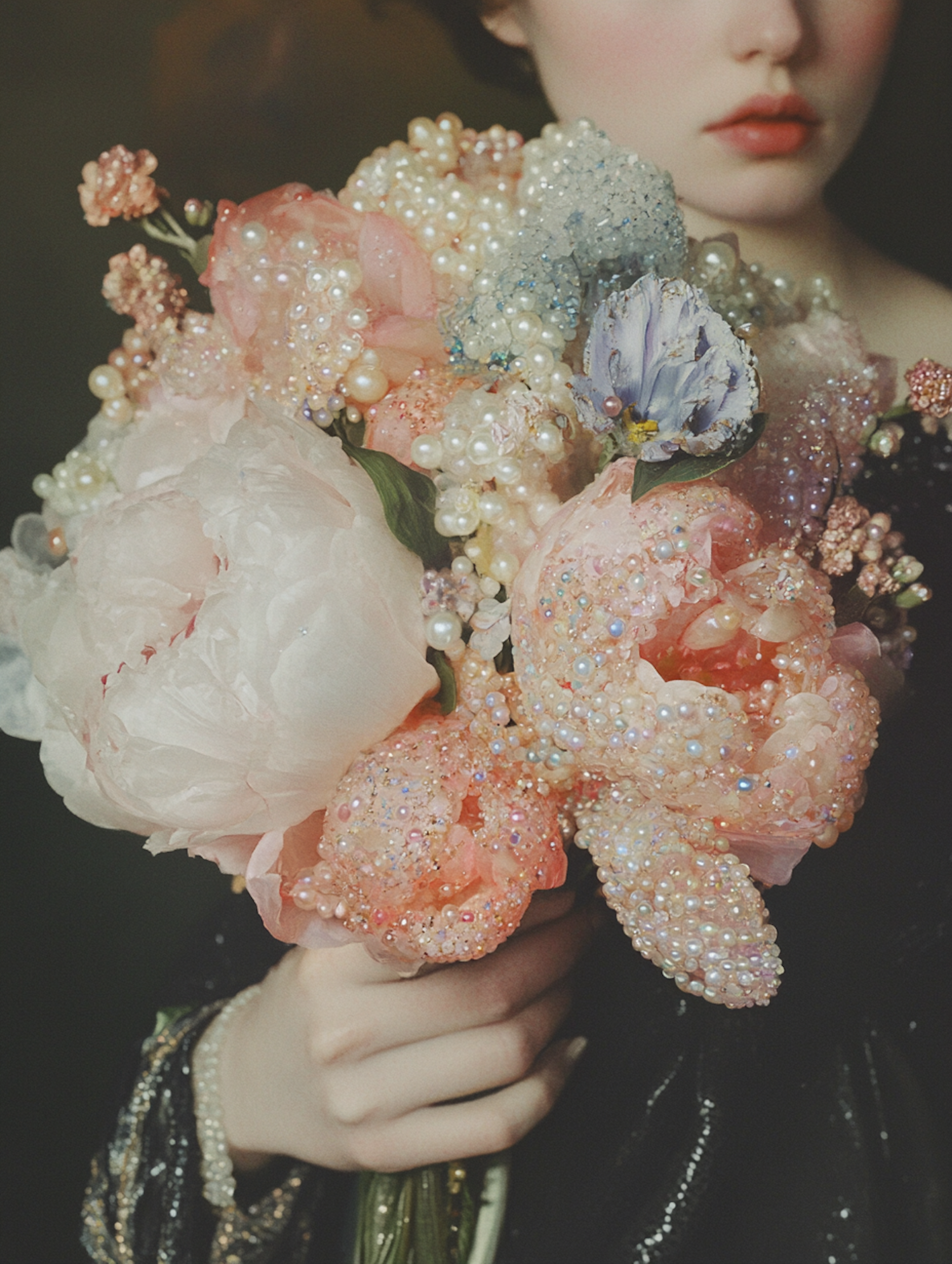 A stunning bouquet of pink and white flowers adorned with pearls and glitter, held by a person in a dark, shimmering outfit.