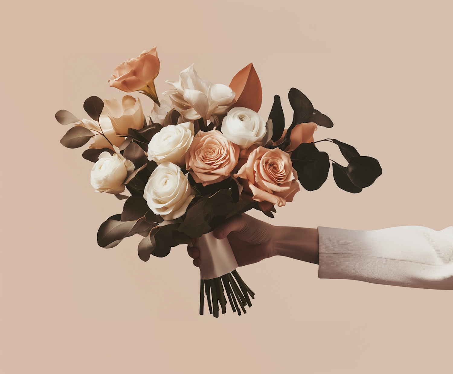 Elegant bouquet of peach and white roses with dark green leaves against a beige background, held by a hand in a white sleeve.