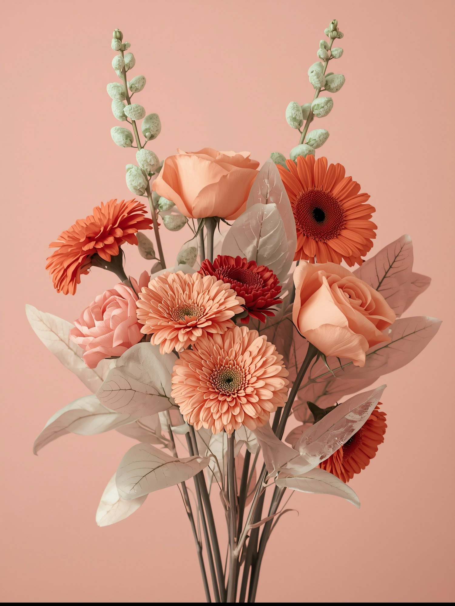 A beautiful bouquet of orange and peach flowers with green foliage, set against a soft peach background, creating a warm and elegant scene.