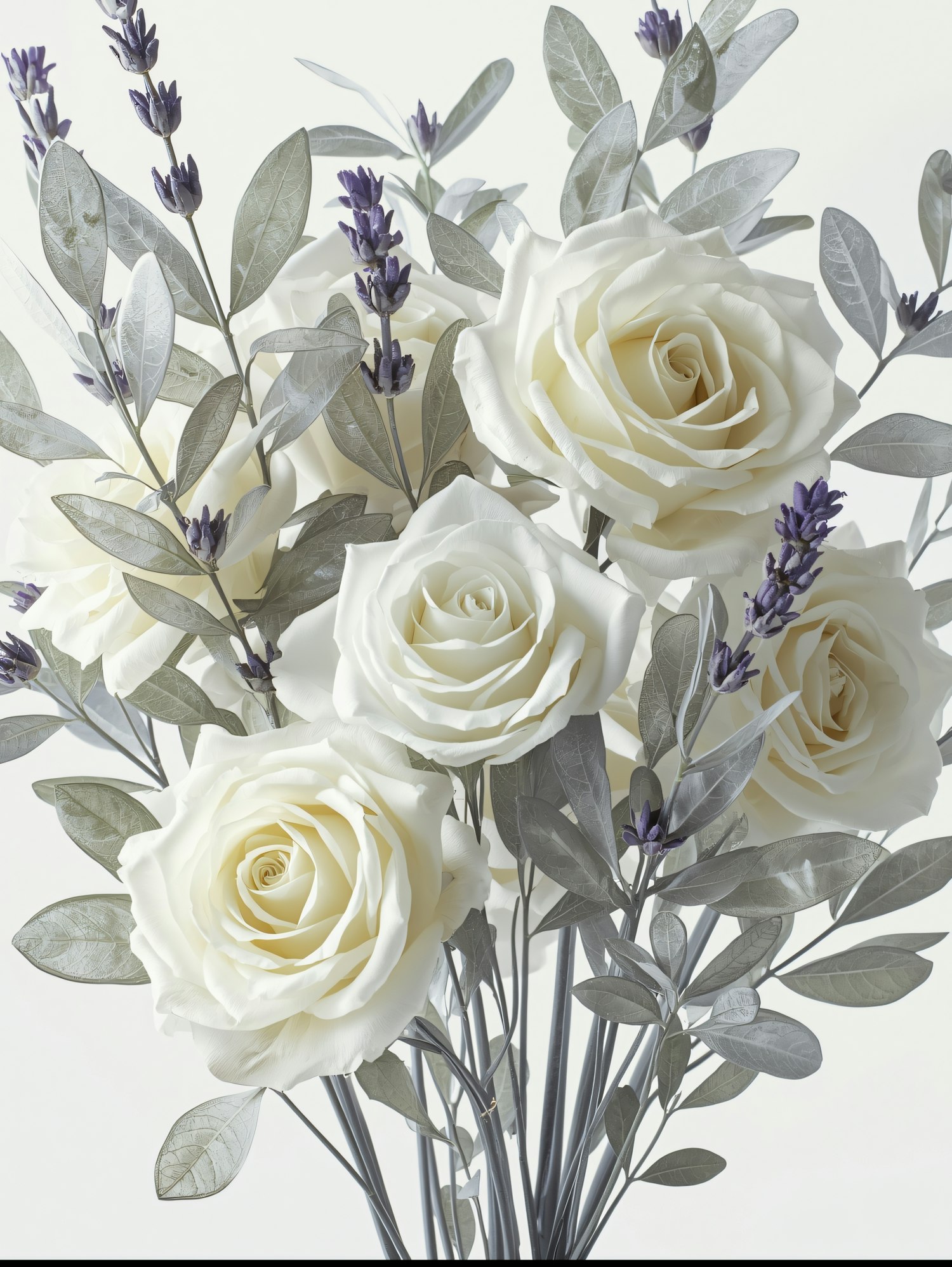 A stunning bouquet of white roses, lavender sprigs, and silver-green leaves, arranged elegantly against a white background.