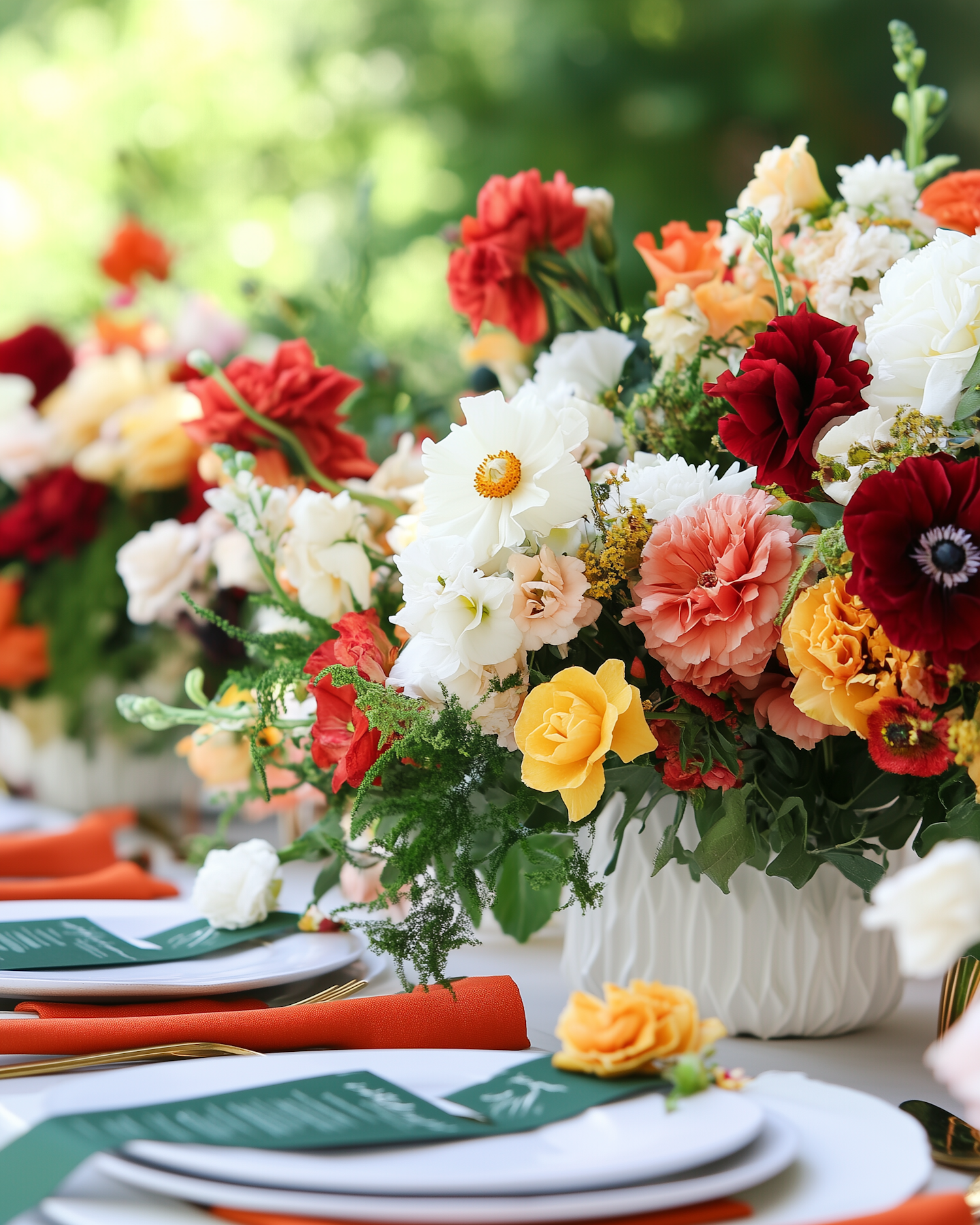 Elegant table setting with vibrant floral centerpieces, white plates, orange napkins, and green menu cards in a lush outdoor setting.