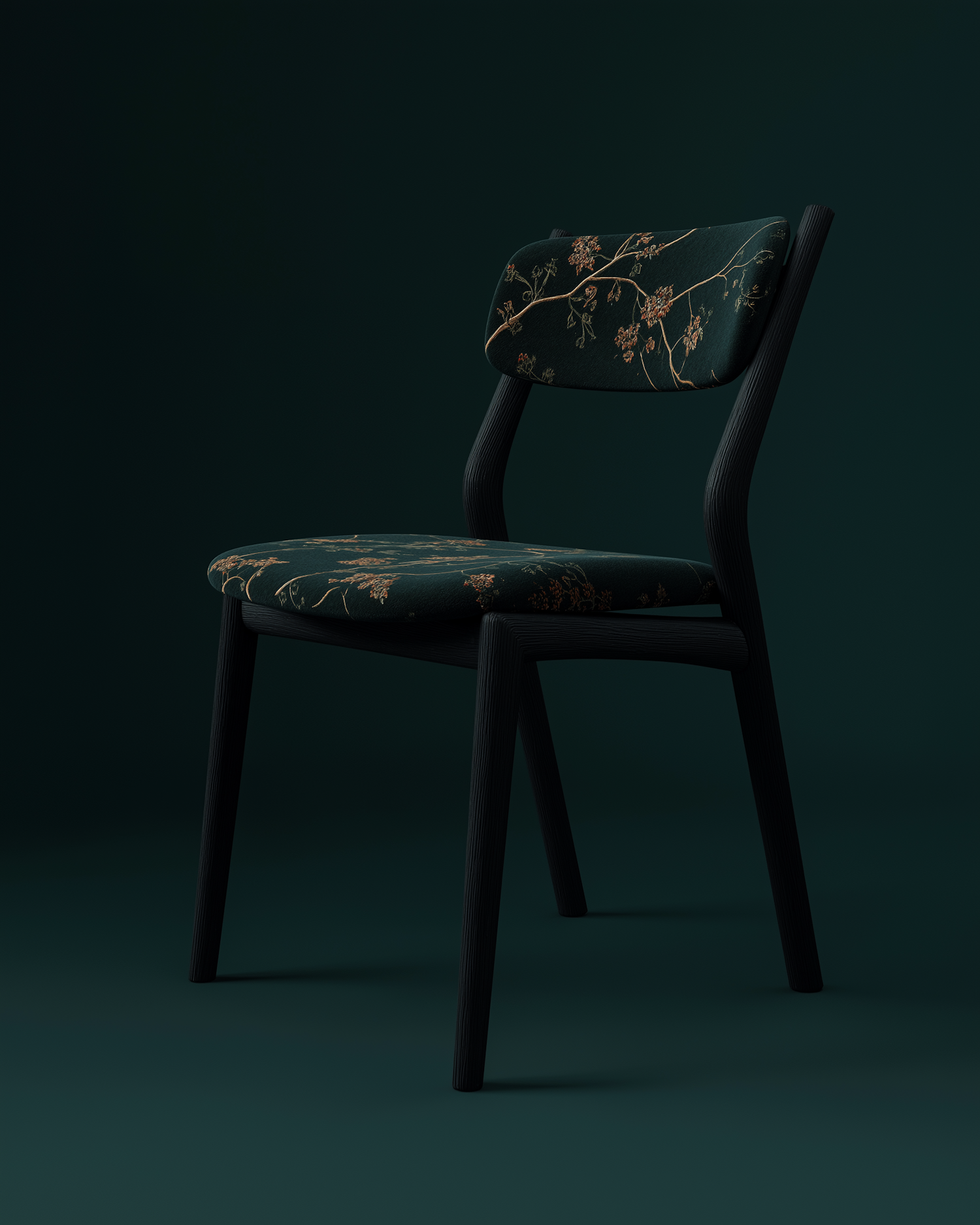 Elegant chair with dark wood frame and floral-patterned green upholstery, perfect for modern interiors with a classic touch.