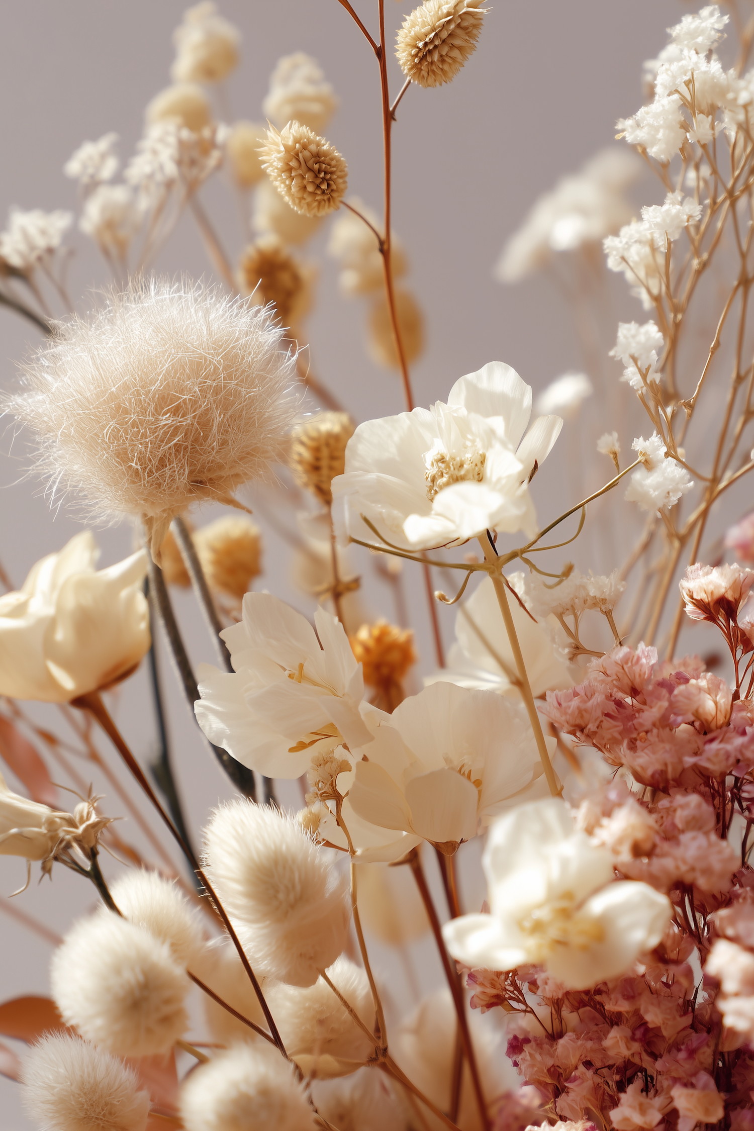 A soft, neutral-toned floral arrangement with dried bunny tails, white poppies, and pale pink flowers, perfect for rustic or modern decor.
