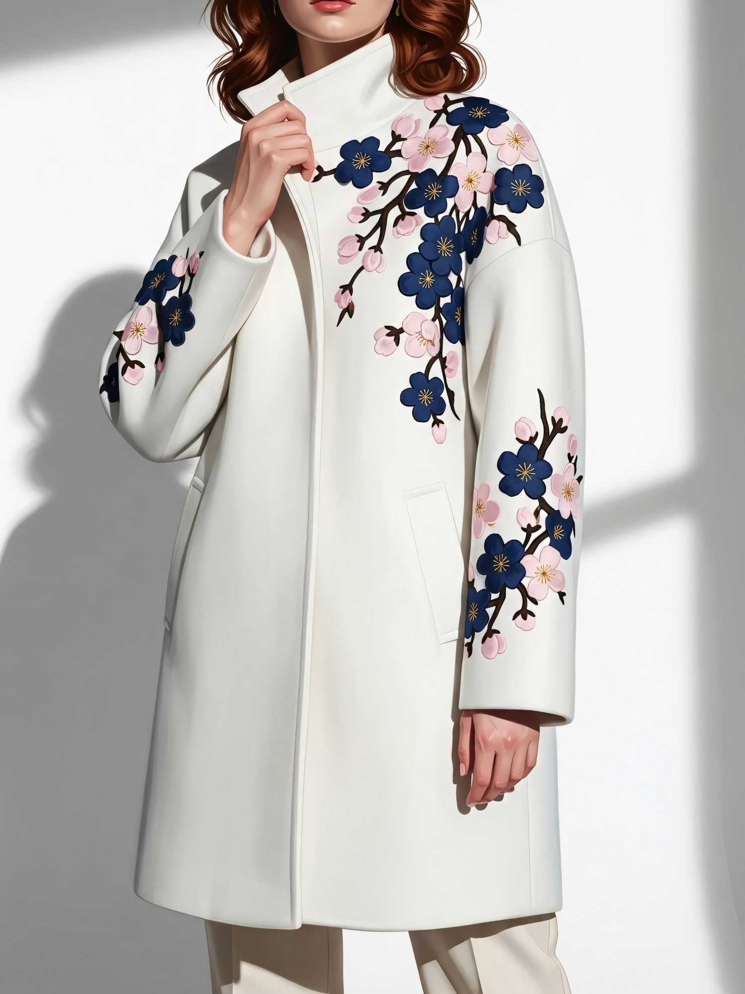 Elegant white coat with blue and pink floral embroidery, worn by a stylish woman in a minimalistic setting.