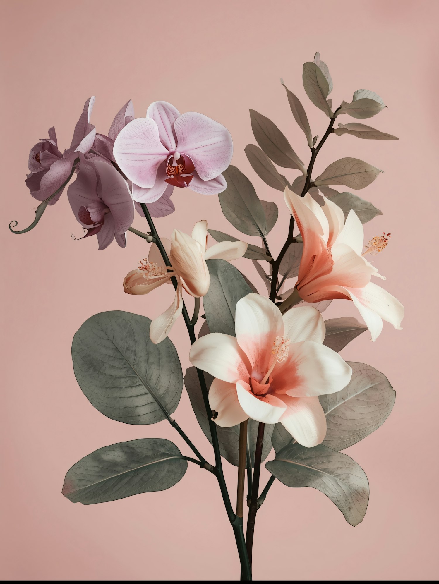 A soft pink floral arrangement featuring orchids and lilies with muted green leaves, creating a serene and elegant composition.