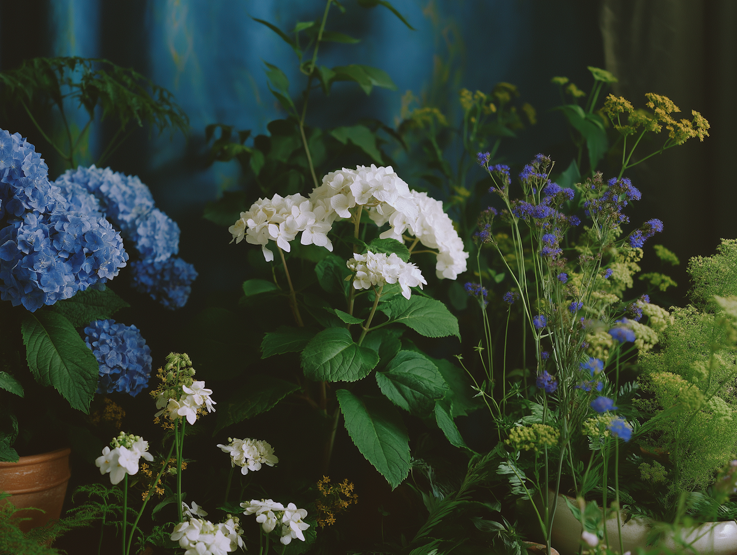Elegant arrangement of white and blue hydrangeas with lush green leaves, set against a soft blue and green backdrop.