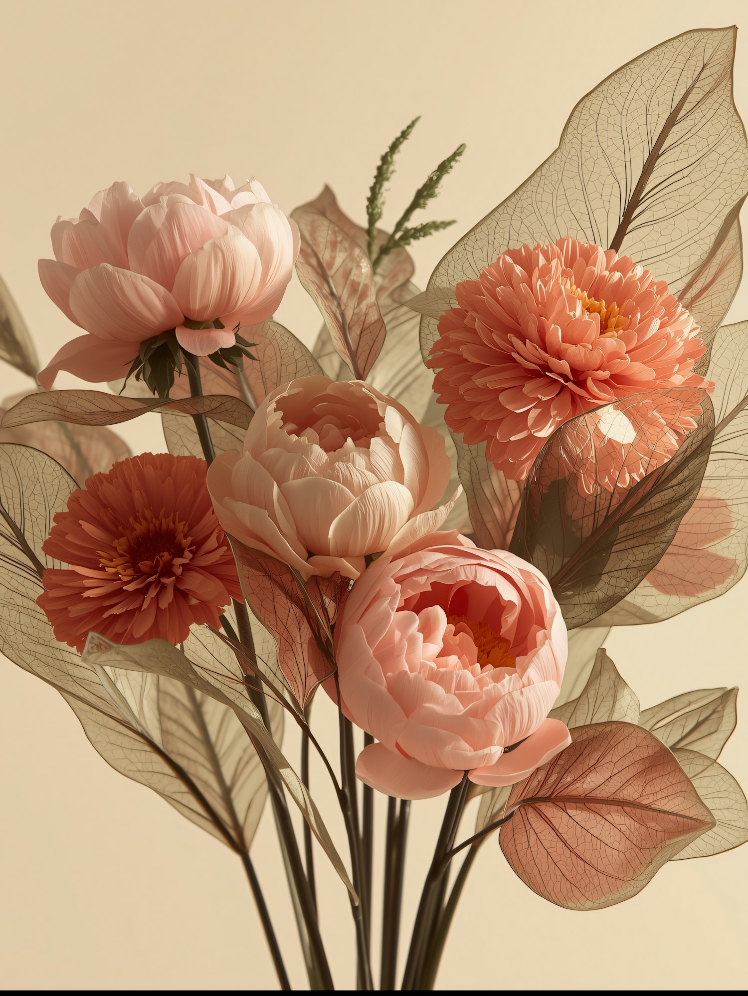 A stunning floral arrangement featuring pink and coral blooms with translucent leaves, set against a soft beige background.