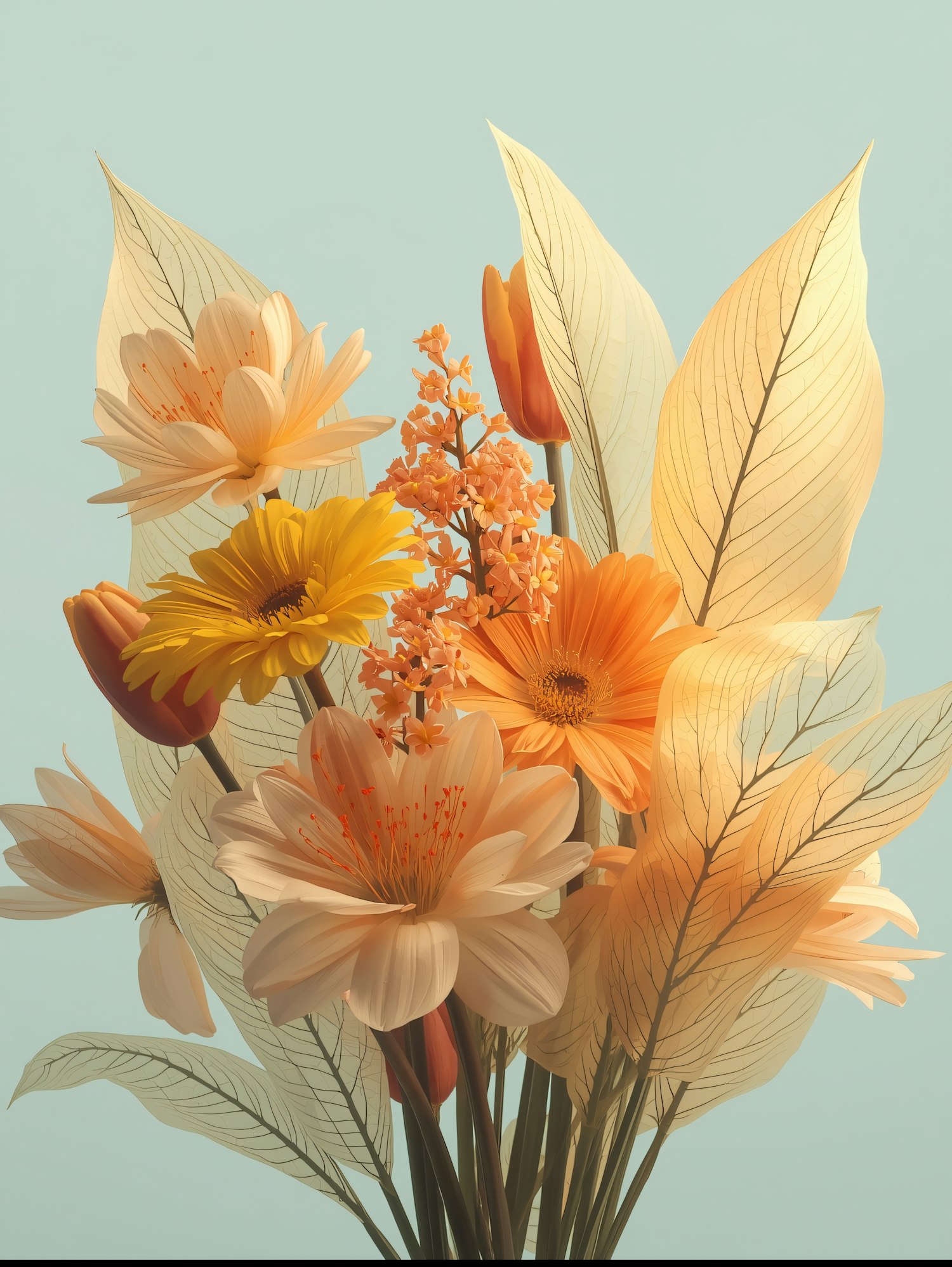 A stunning floral arrangement with orange, yellow, and cream flowers, detailed leaves, and a soft pastel background.