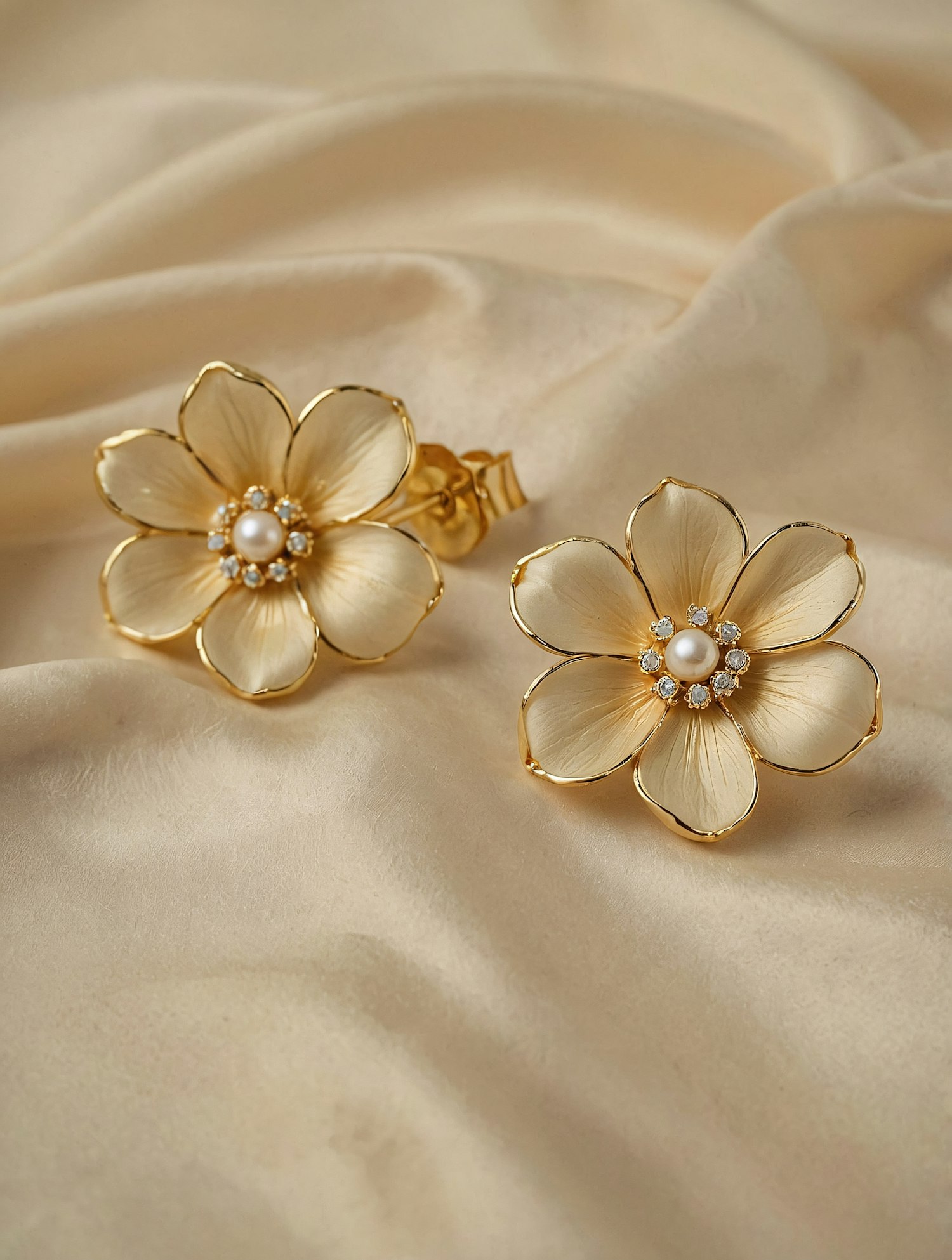 Elegant gold-tone floral earrings with pearl and gemstone accents, displayed on soft beige fabric for a luxurious and refined look.