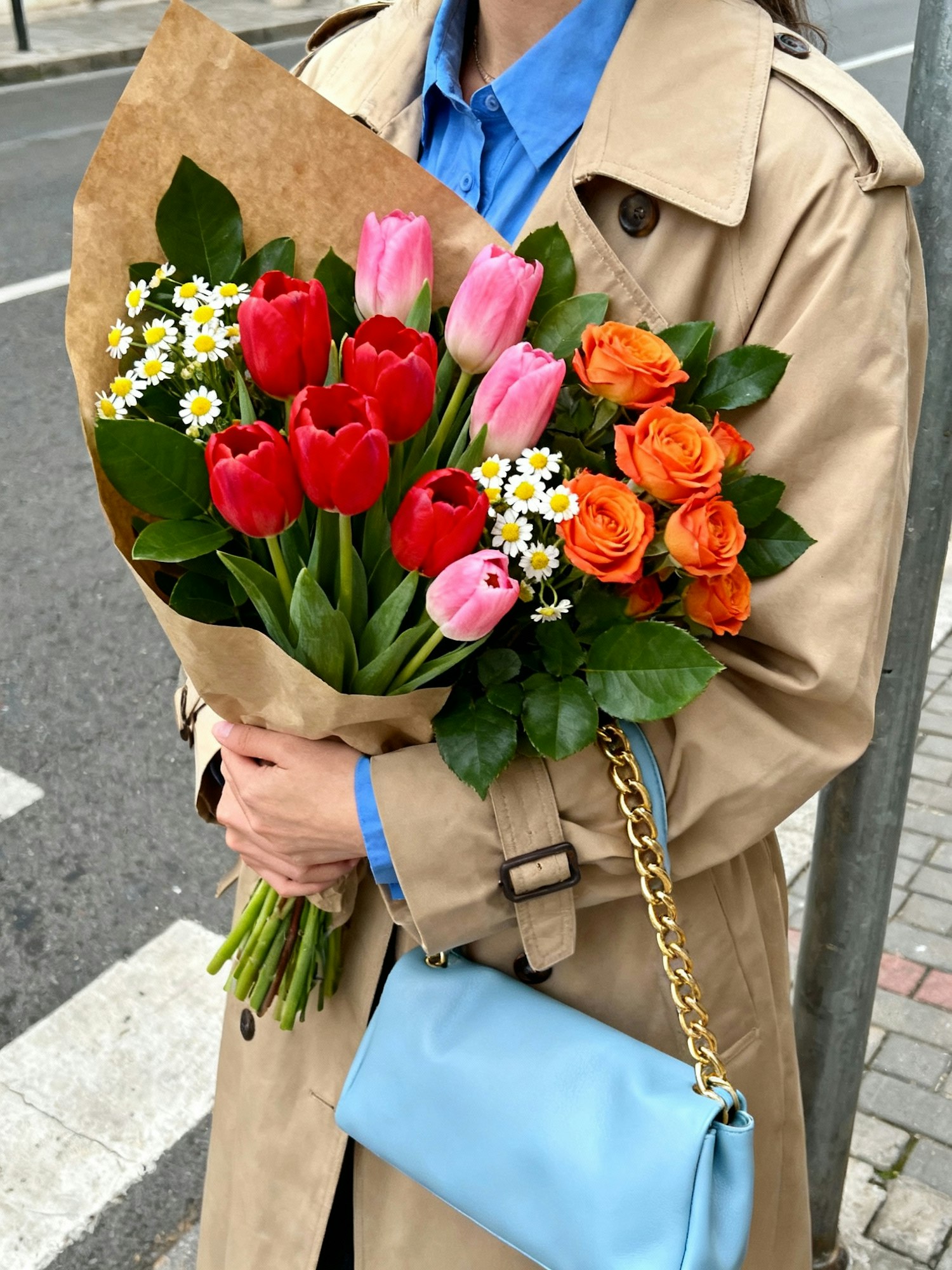 Vibrant bold aesthetic photograph, natural lifestyle style, soft daylight, candid framing, rich textures, colorful flower bouquet, not staged, influencer style photography, high quality realistic details — A person holding a bouquet wrapped in kraft paper, bouquet filled with red tulips, pink tulips, orange roses and small white daisies with yellow centers, lush green leaves adding contrast, person dressed in a beige trench coat and blue shirt, a pastel blue handbag with gold chain hanging from their arm, urban street background with pavement and pole, candid lifestyle vibe