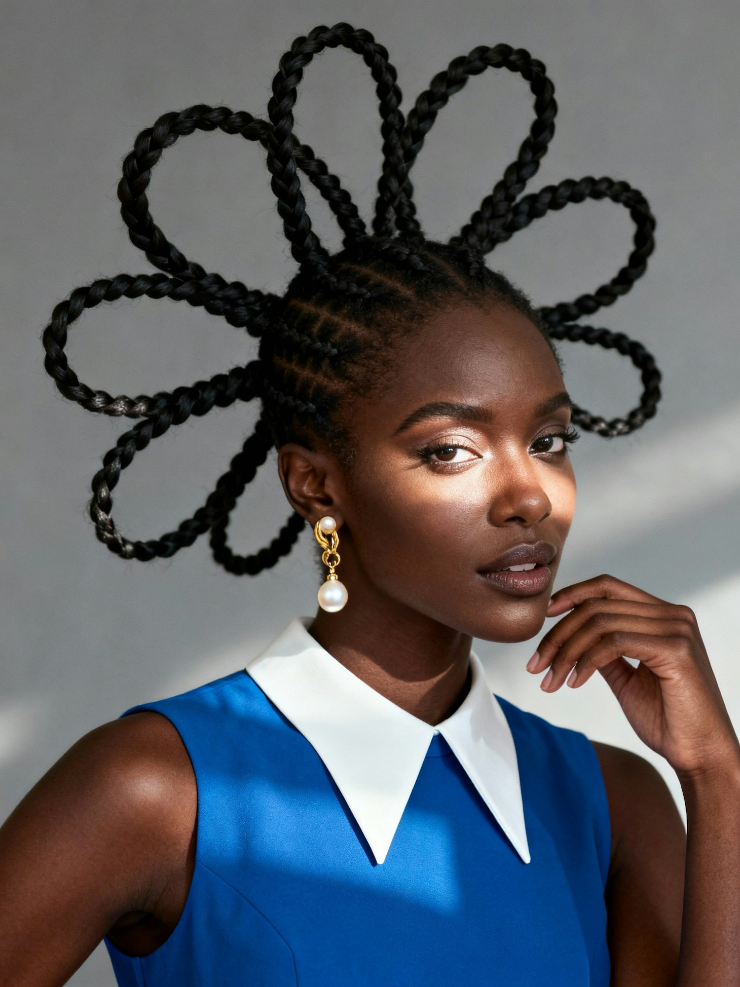 Waist-up, high-definition portrait of a Black woman wearing a sleeveless blue dress with a distinctive white pointed collar. Her hair is styled in a radial braid pattern, with multiple braids extending outward from her head. She wears gold and pearl drop earrings and holds one hand near her face with a confident expression. The neutral gray background enhances the blue tones of her outfit and the sculptural lines of her hairstyle, making the layered textures stand out. Lighting is soft and directional, casting gentle highlights across her face and garment. The mood is bold, retro-modern, and editorial—ideal for an Afro-fusion fashion portrait or sculptural identity showcase.