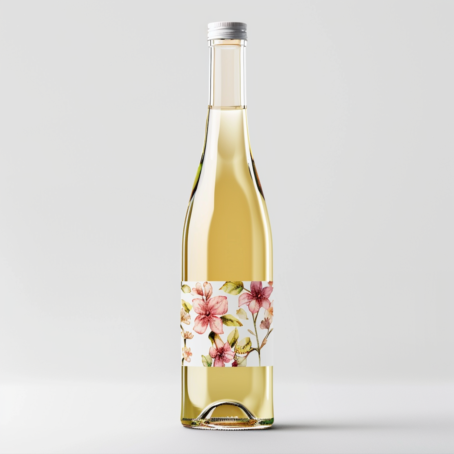 Elegant Floral-Labelled Bottle with Pale Yellow Liquid