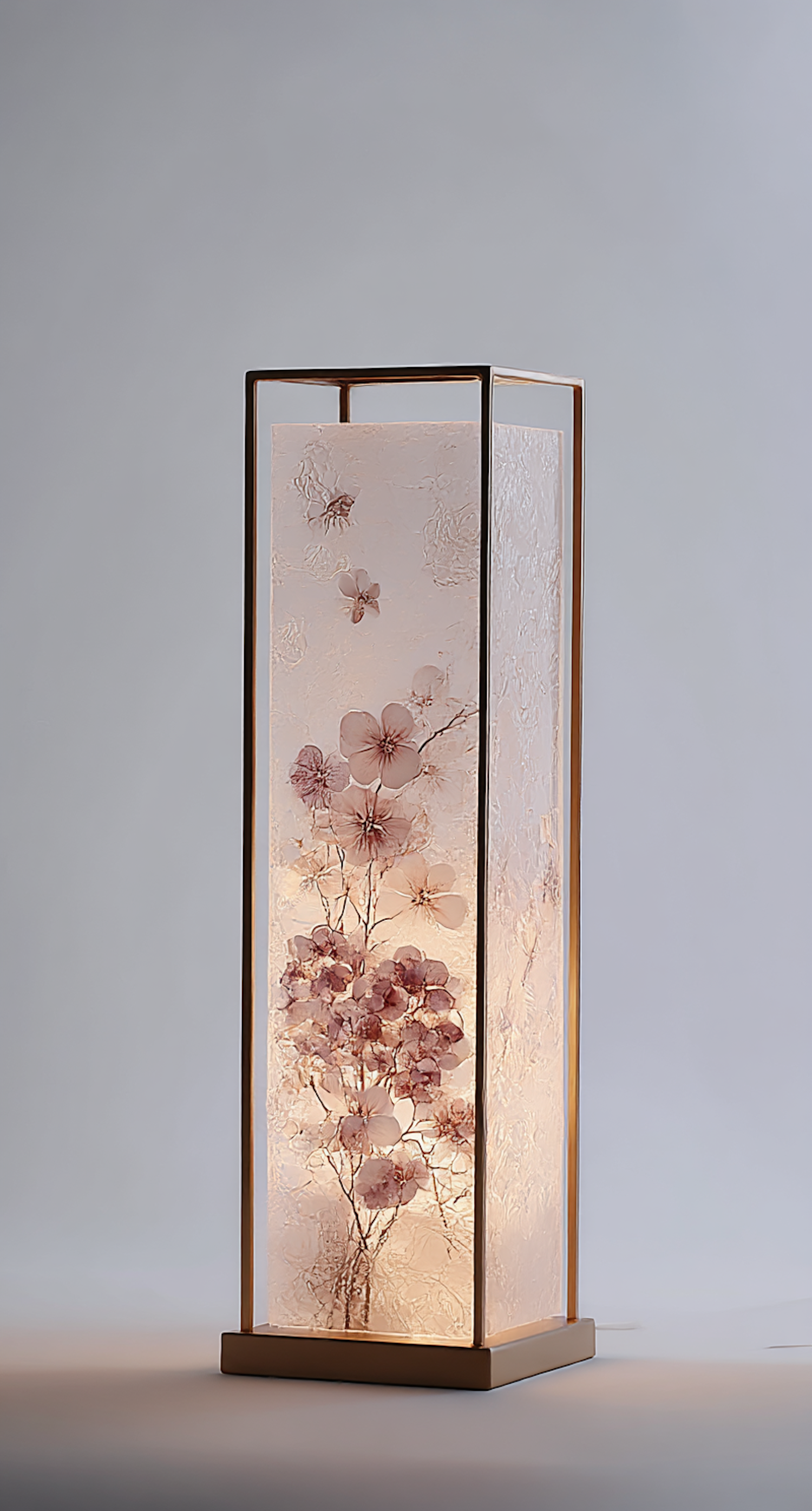Elegant rectangular lamp with embedded pink floral designs, emitting a warm glow. Perfect for adding a touch of nature-inspired decor.