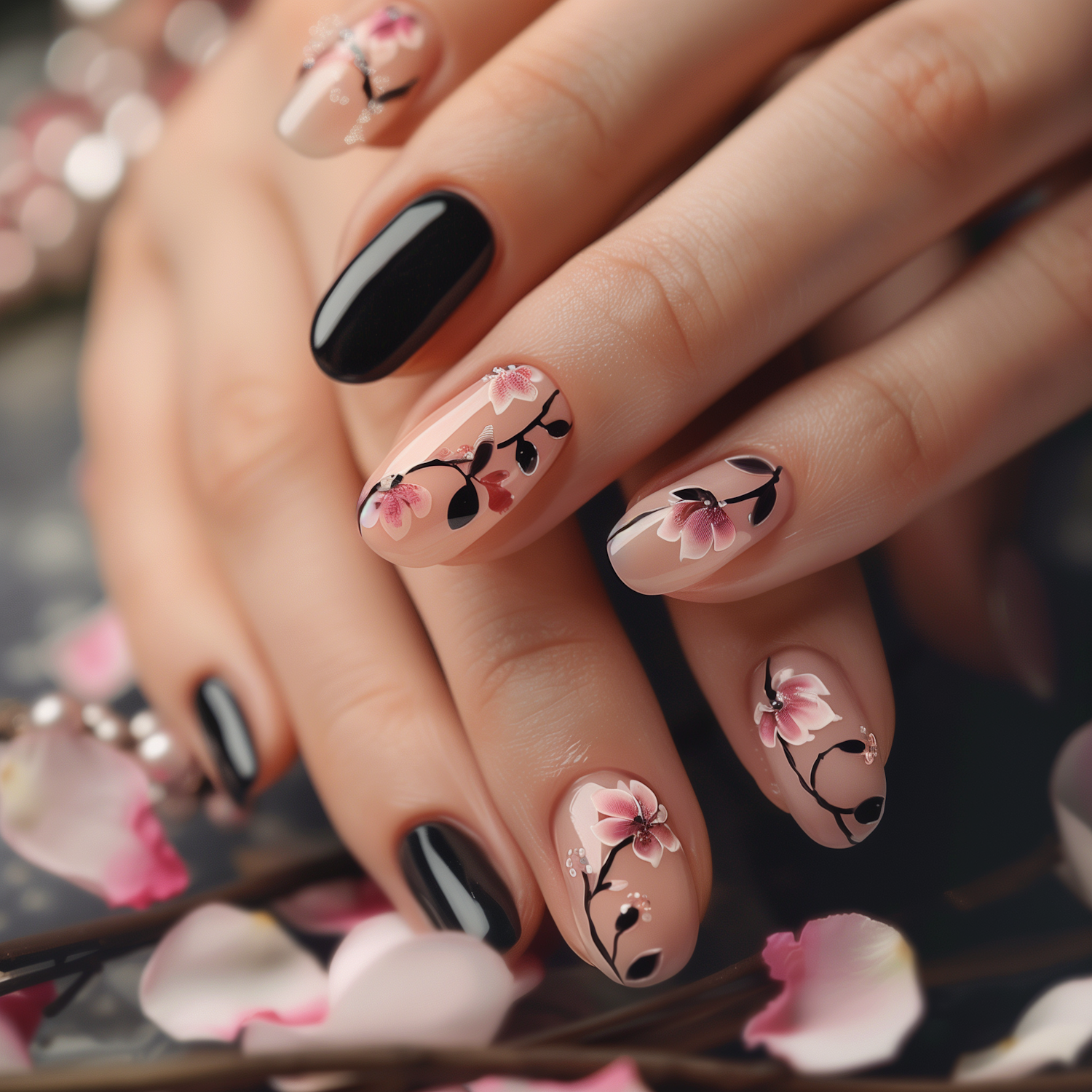 Elegant nail art with cherry blossom design on nude and black nails, featuring intricate floral details and a soft, artistic look.