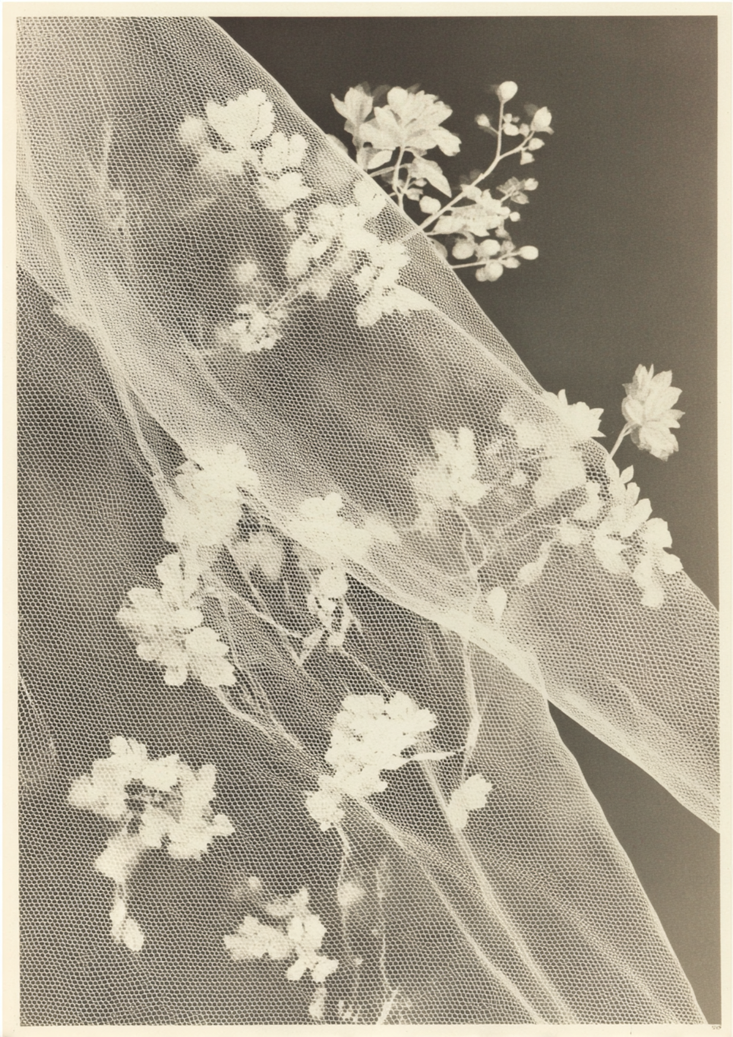 A delicate floral arrangement overlaid with fine mesh fabric, creating a serene and elegant composition with soft contrasts.