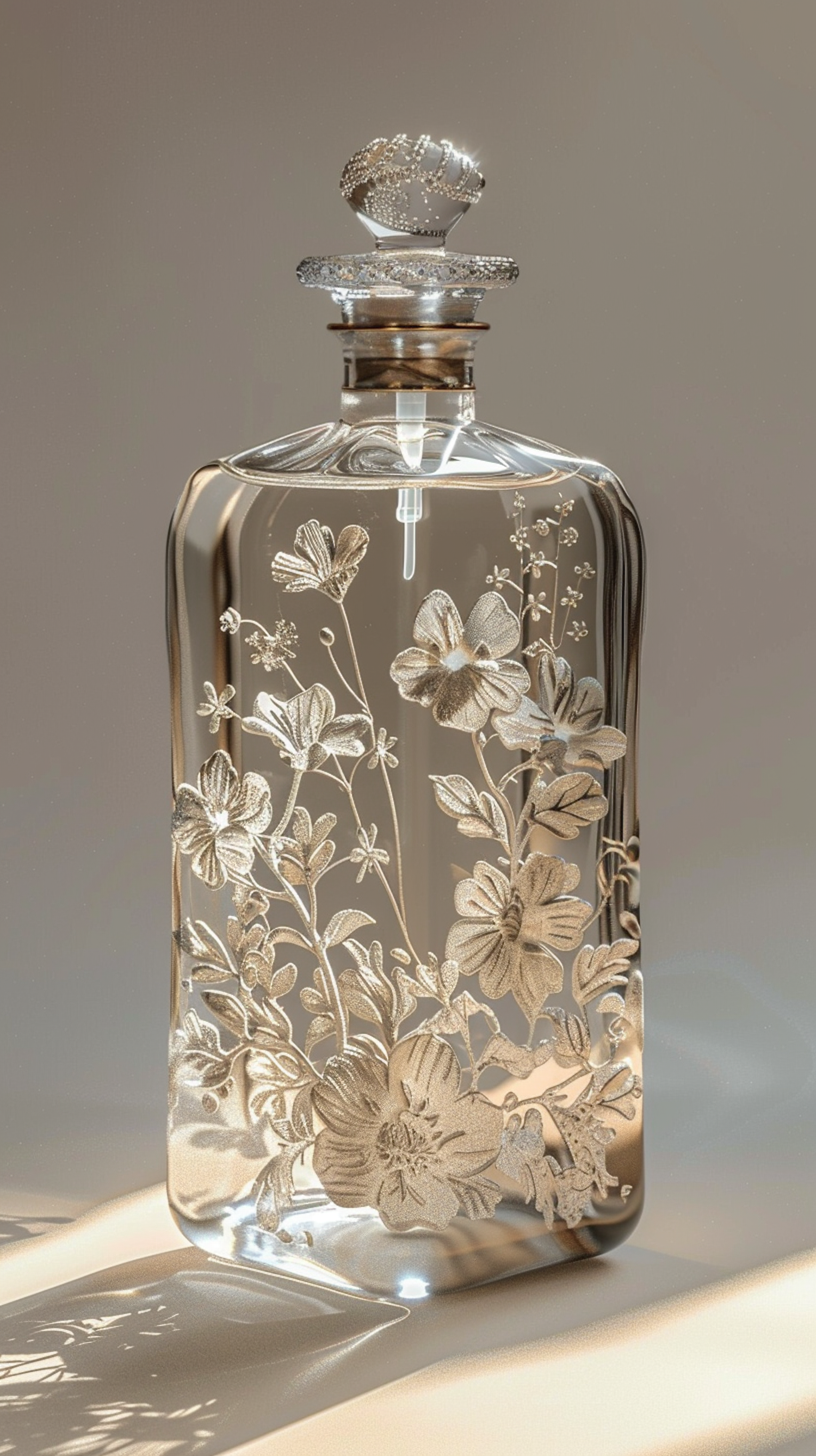 Elegant glass bottle with intricate floral engravings and a sparkling stopper, casting delicate shadows in soft lighting.