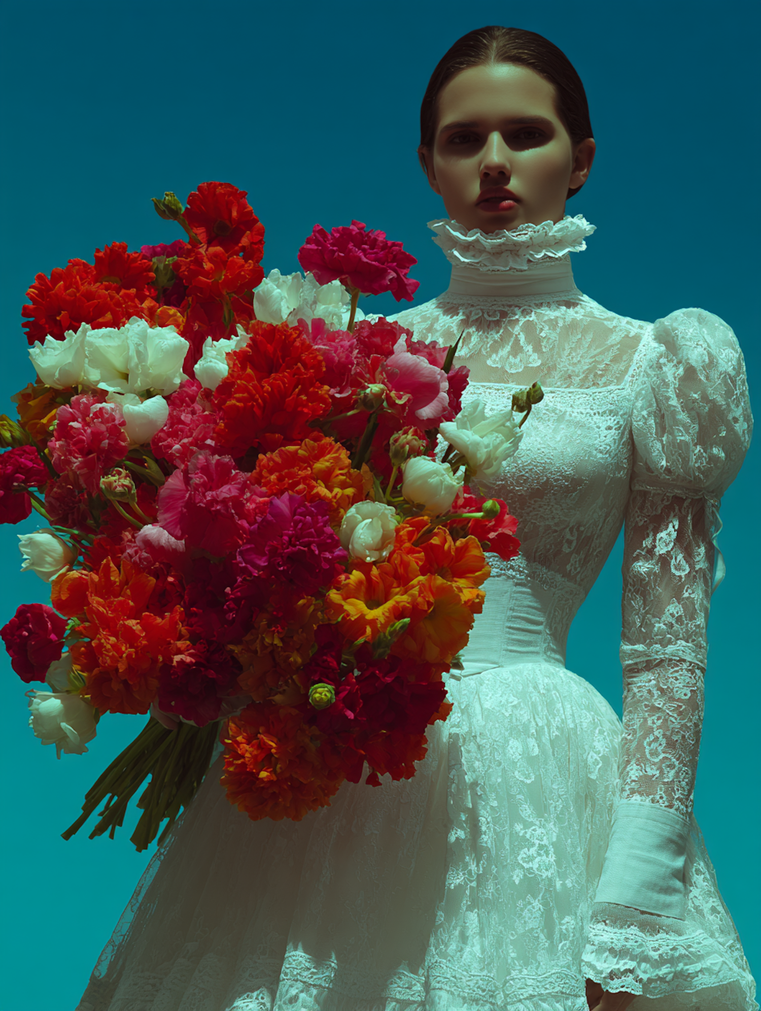 A woman in a white lace dress holds a vibrant bouquet of flowers against a clear blue sky, creating a striking and elegant composition.