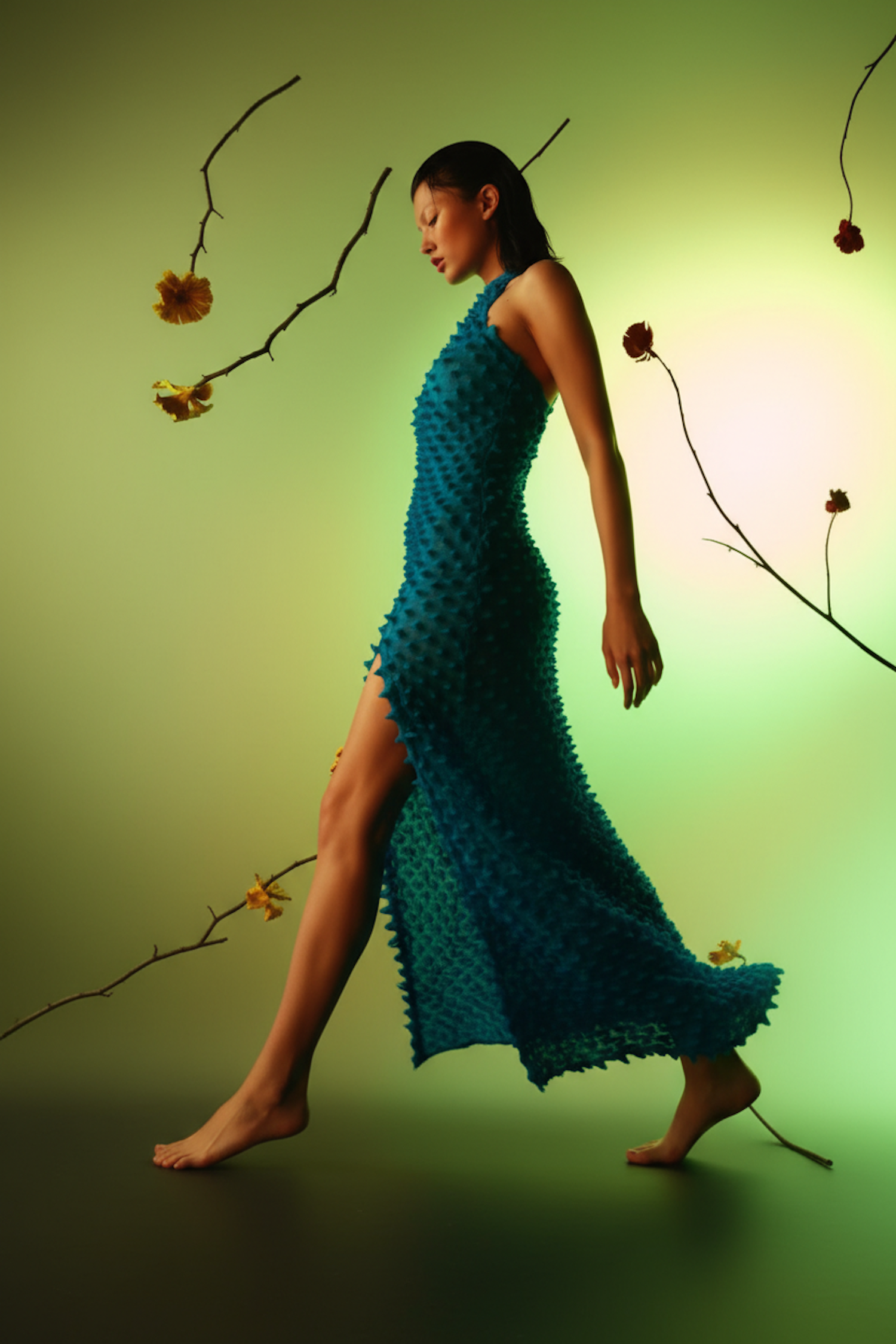A woman in a textured blue dress poses gracefully against a green gradient background with branches and flowers, creating an artistic scene.