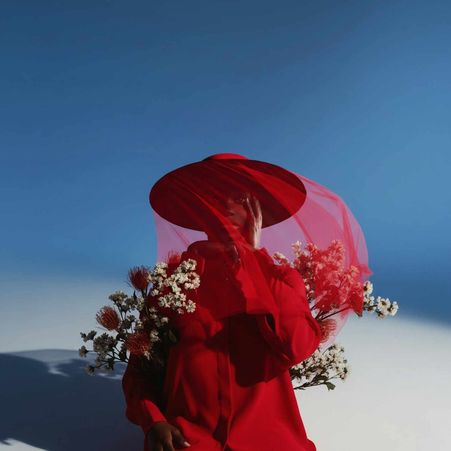 A person in a red outfit with a wide-brimmed hat and veil, surrounded by flowers, set against a gradient blue background.
