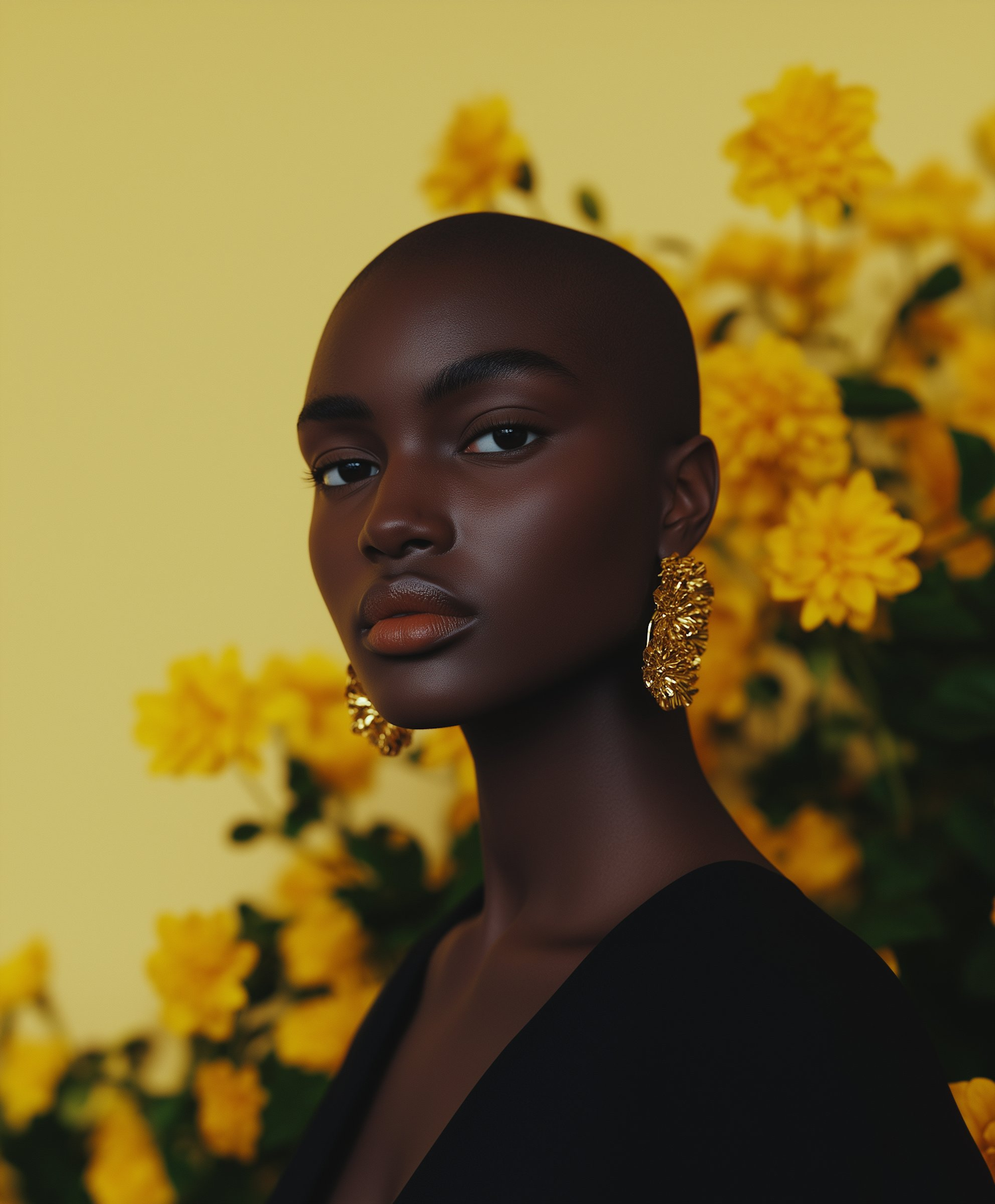 Elegant portrait of a person with gold earrings and a floral yellow background, showcasing vibrant colors and striking contrasts.