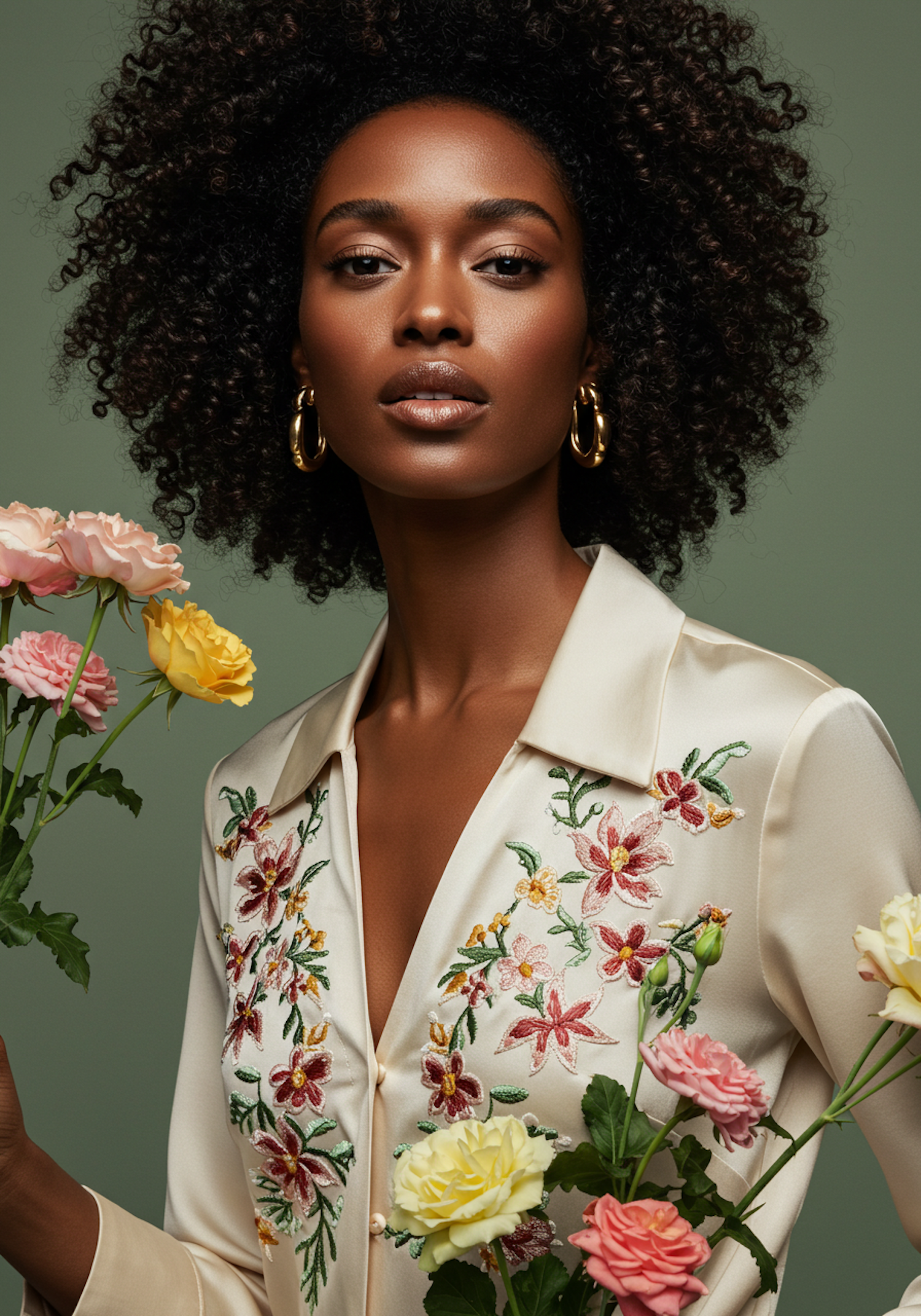 Elegant portrait of a woman in a floral embroidered blouse, holding pastel roses against a muted green background.
