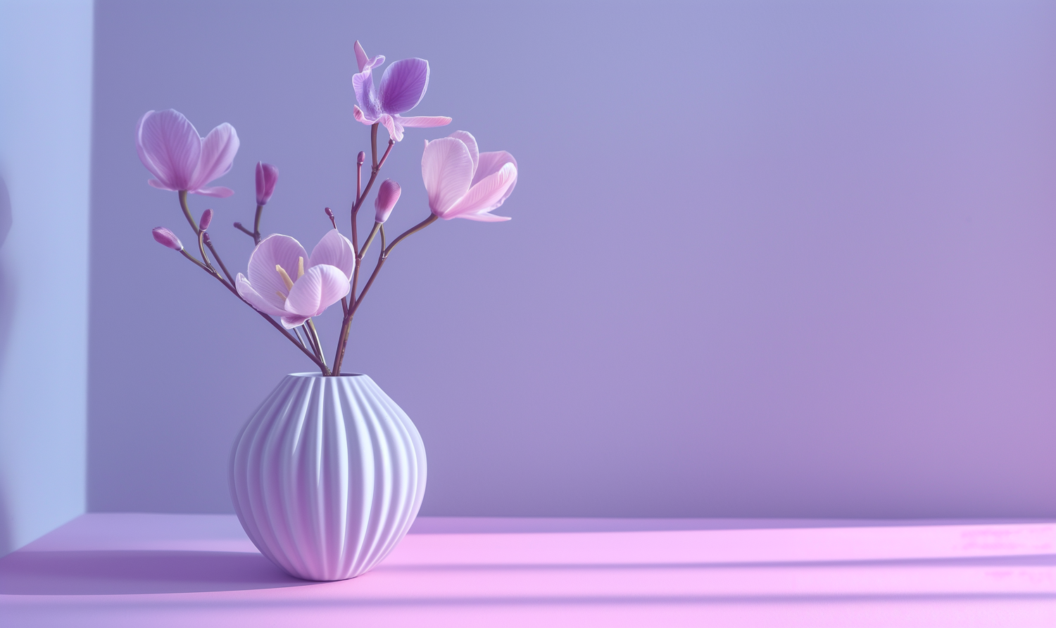 Elegant pink flowers in a ribbed white vase on a pastel pink surface against a lavender background. Minimalist and serene decor.